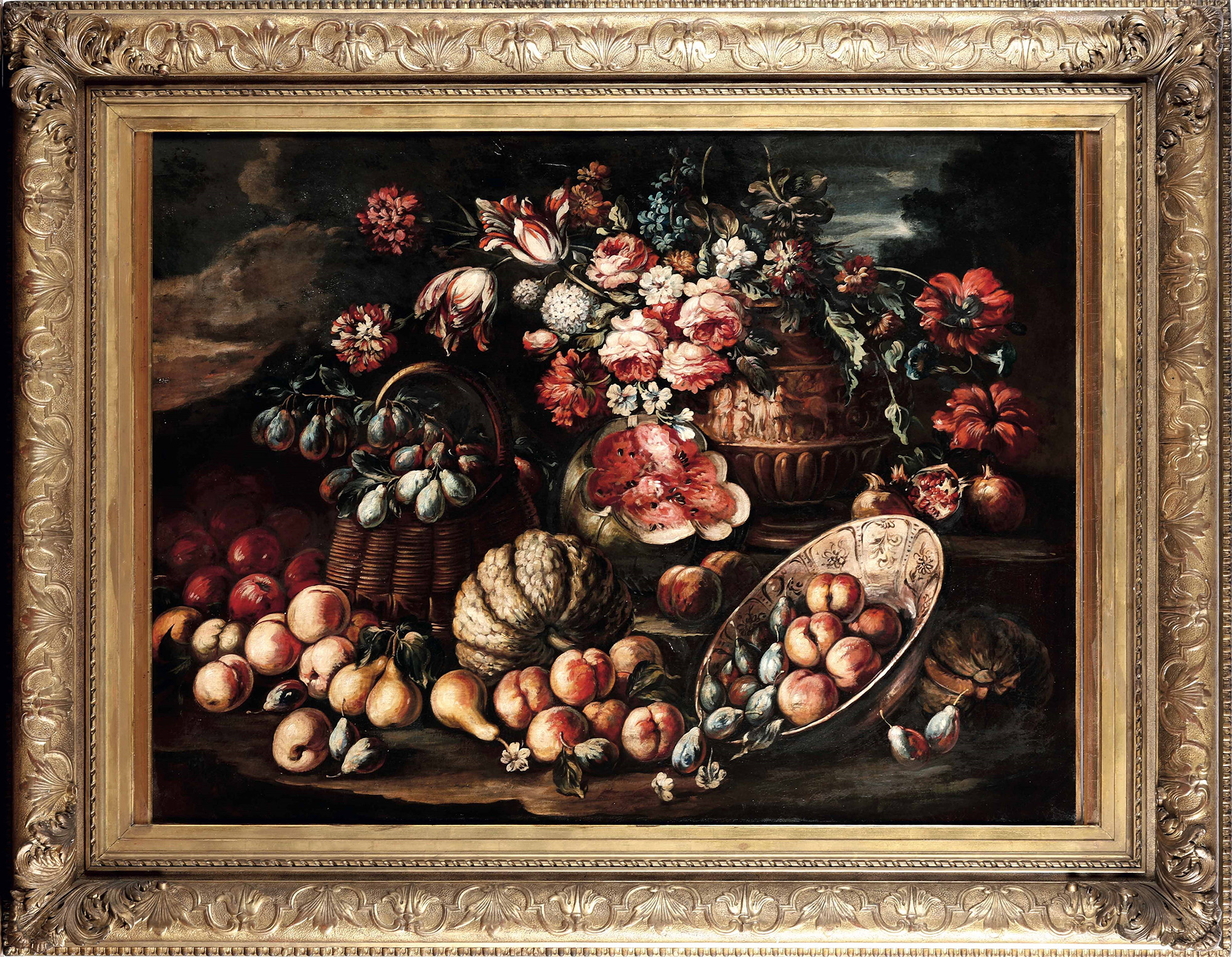 Scuola del XVIII secolo, Natura morta con trionfo di fiori e frutti