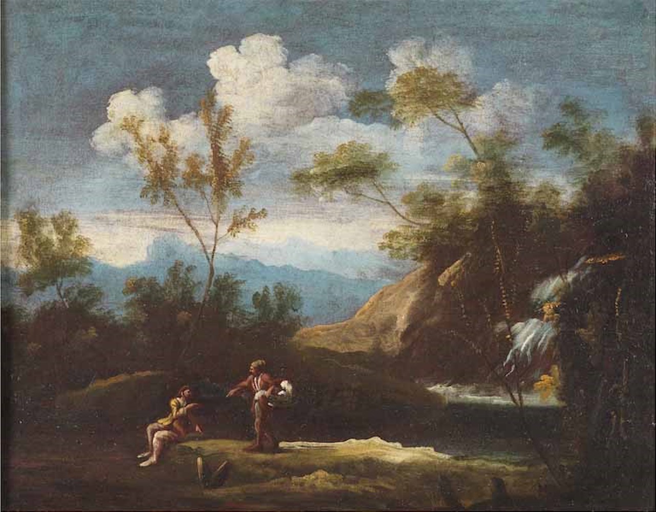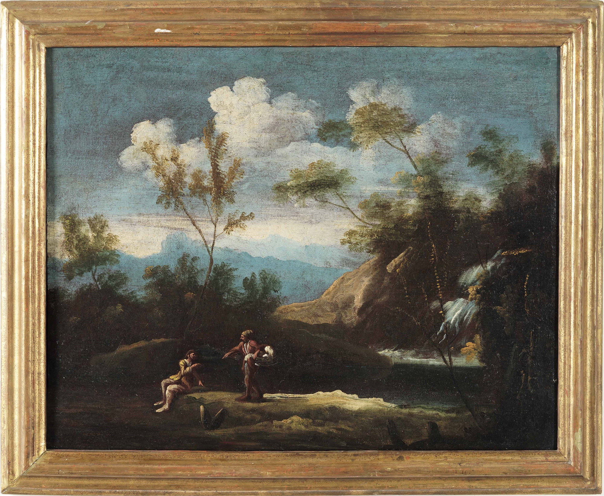 Tavella Carlo Antonio ambito di, Paesaggio con cascata e personaggi