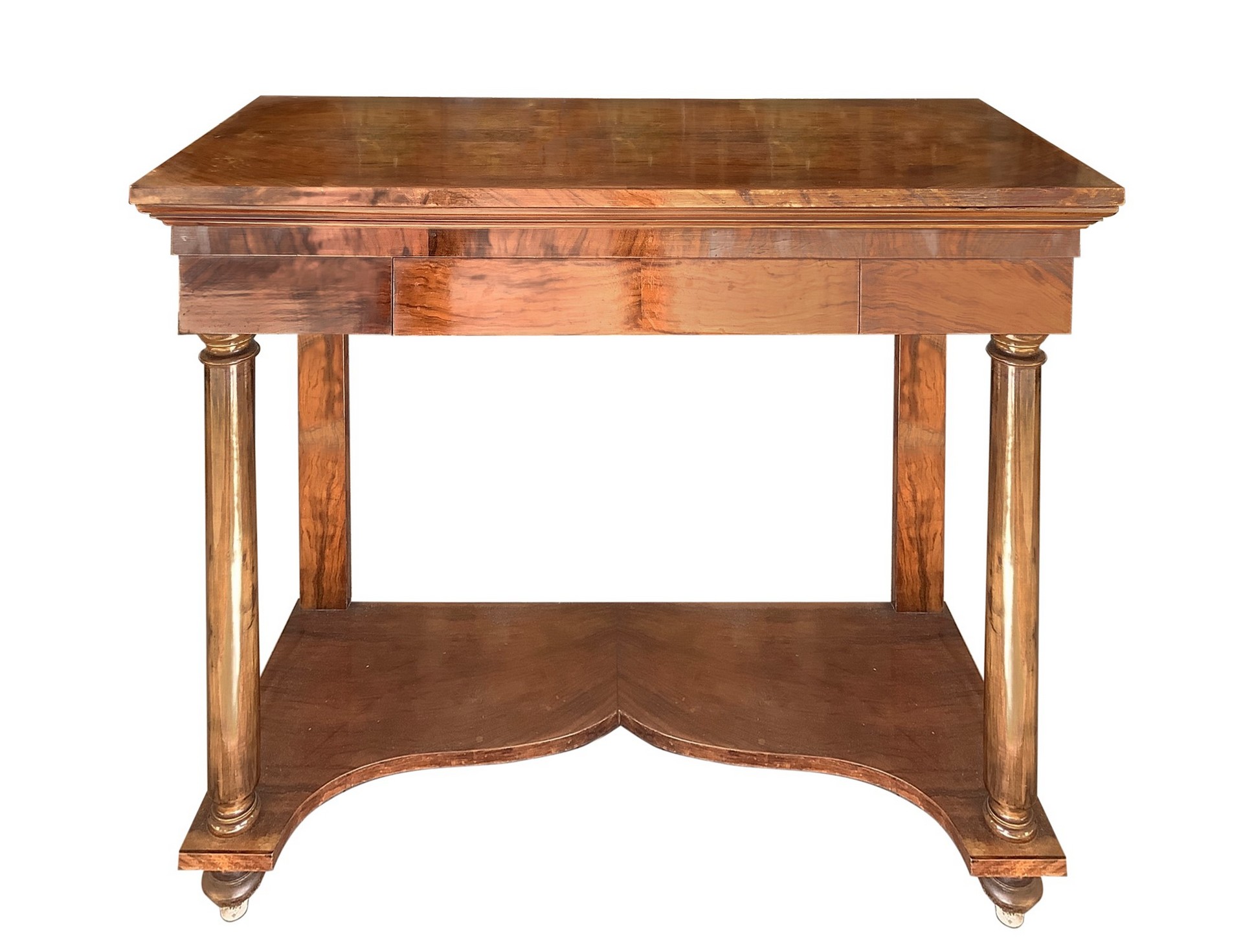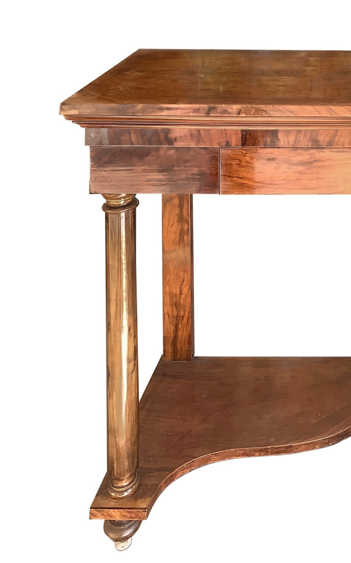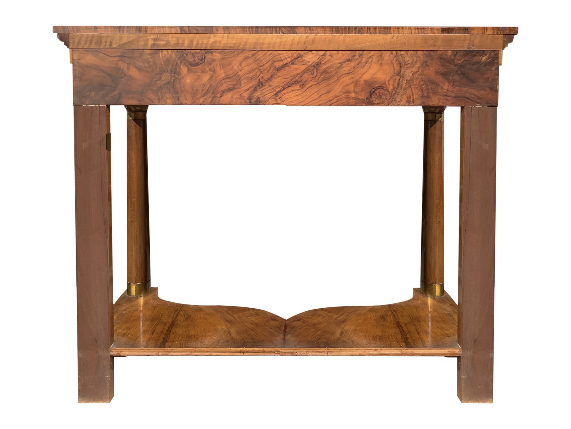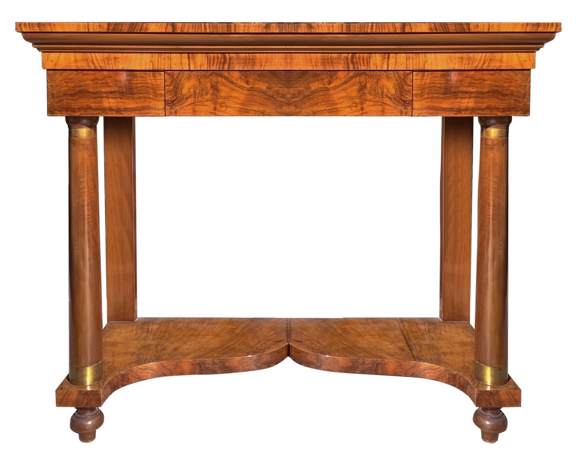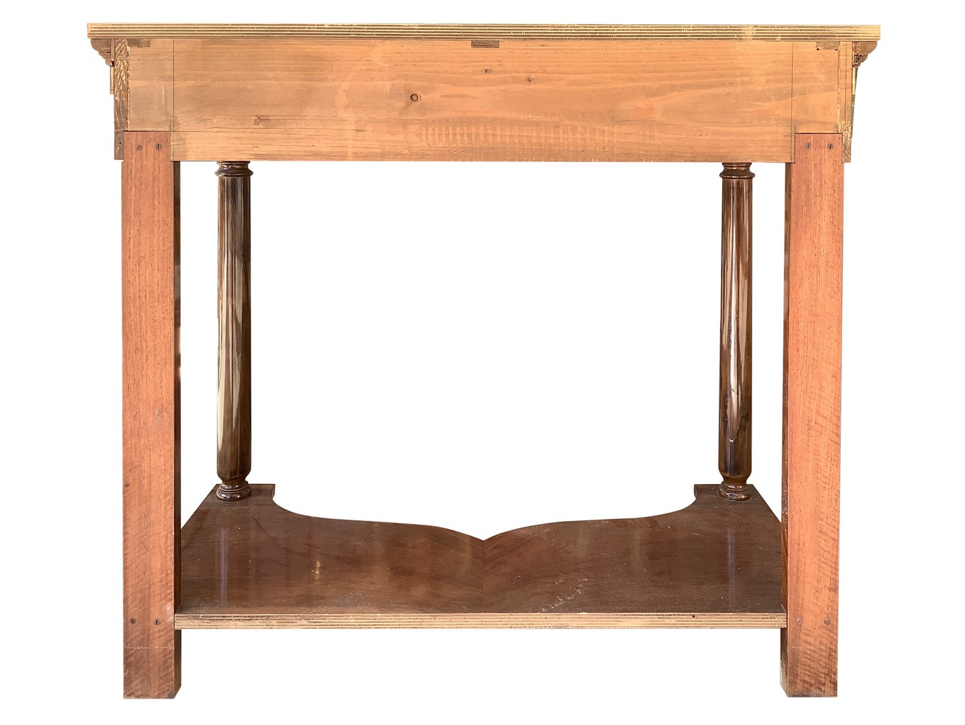 Coppia di console con piedi a colonna, 19th / 20th century In legno di piuma di mogano. Piano filettato in legno chiaro, cassetto sottopiano. Applicazione in metallo dorato sulle colonneIn legno di piuma di mogano. Piano filettato in legno chiaro, cassetto sottopiano. Applicazione in metallo dorato sulle colonne