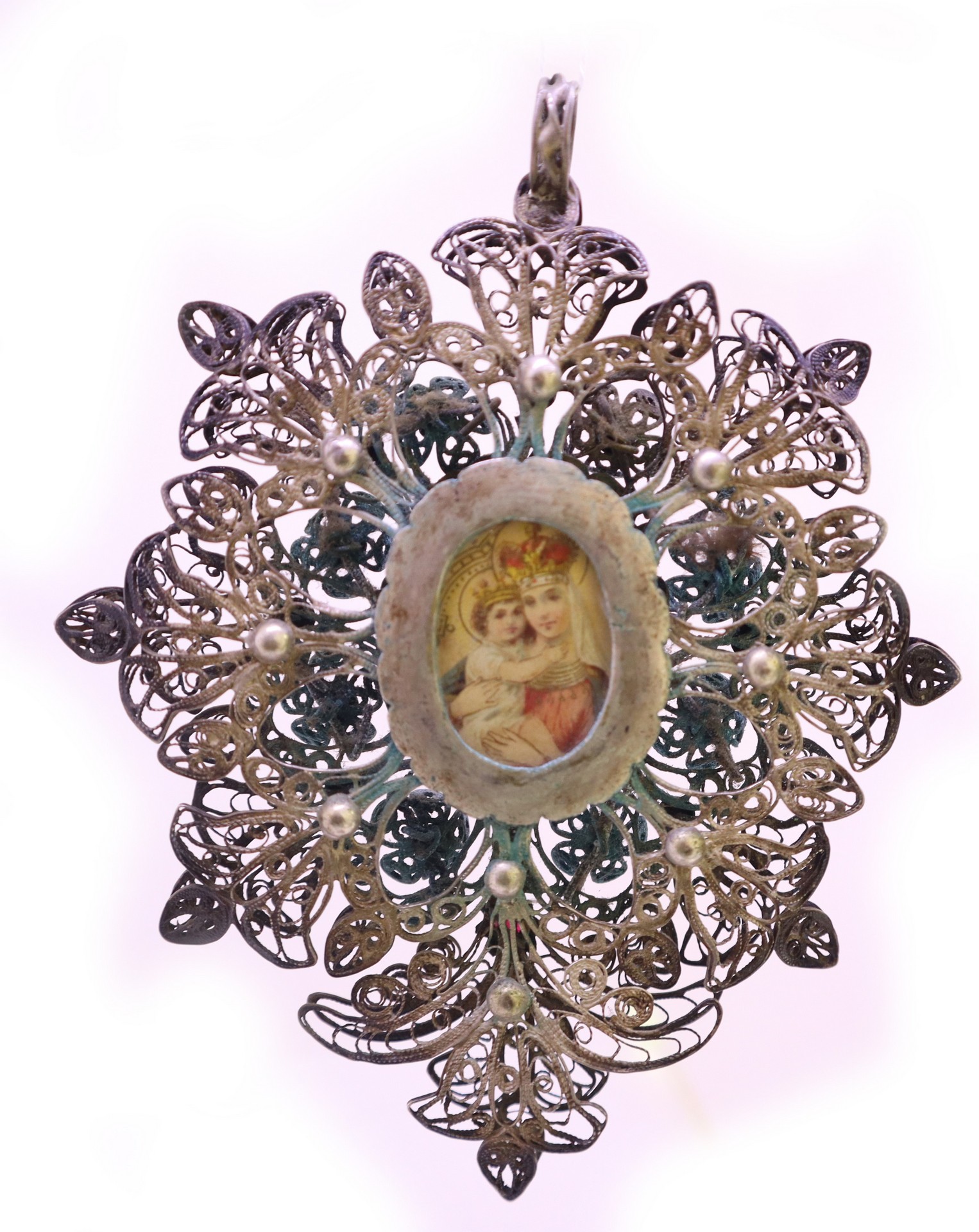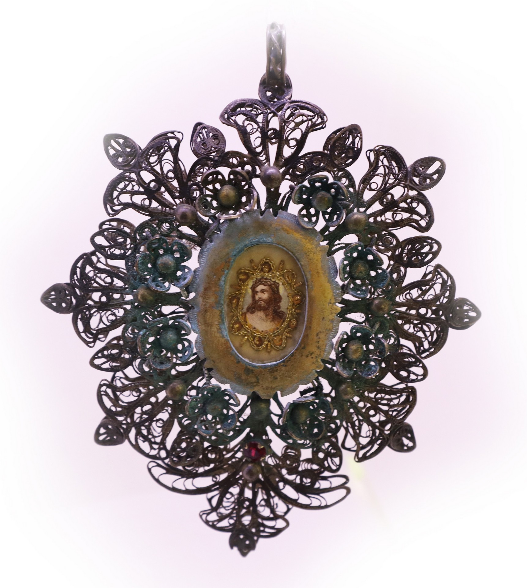 Filigrana in argento, Trapani, 18th century h cm 15,5 x cm 12,5 Opera devozionale in filigrana composta da un decoro floreale fitomorfo in fii d’argento che si ripartono dal cento ove piccole corolle incentrano una nicchia ovale in cui è raffigurata una immagine devozionale in smalto. Opera di esperti artigiani siciliani abili a combinare materiali diversi.Opera devozionale in filigrana composta da un decoro floreale fitomorfo in fii d’argento che si ripartono dal cento ove piccole corolle incentrano una nicchia ovale in cui è raffigurata una immagine devozionale in smalto. Opera di esperti artigiani siciliani abili a combinare materiali diversi.