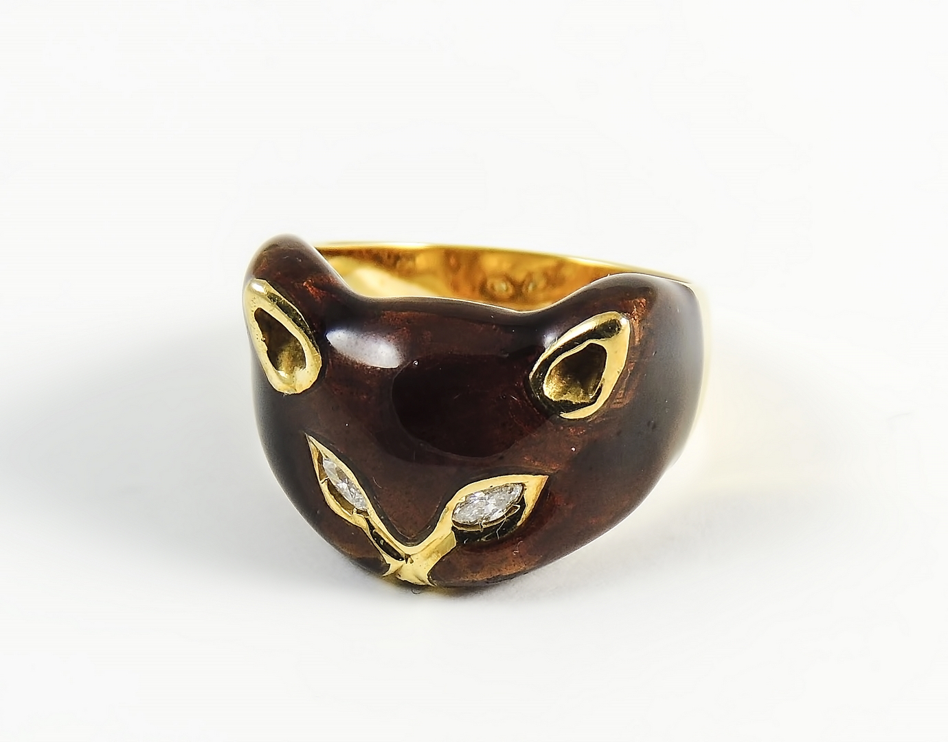 ANELLO IN ORO, SMALTI E BRILLANTINI Mossa, Firenze realizzato come un muso di gatto