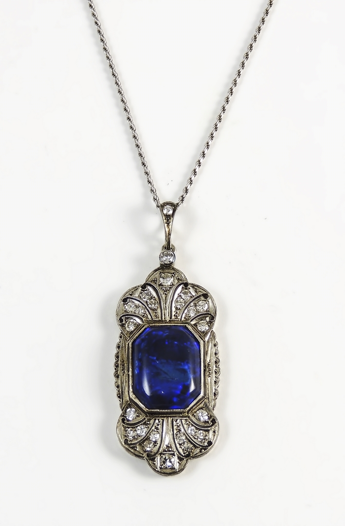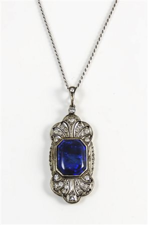 PENDENTE IN PLATINO, OPALE BLU E DIAMANTI Anni Venti di forma sagomata centrato da opale cabochon impreziosito da diamanti taglio vecchio, corredato di catenina in oro bianco di epoca posteriore
