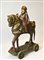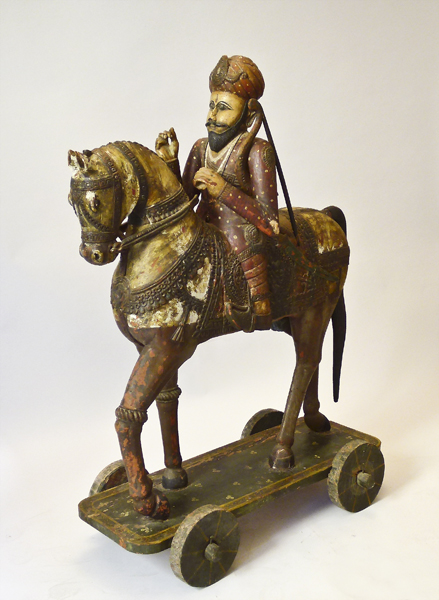 GRANDE CAVALLO GIOCATTOLO IN LEGNO LACCATO India, XIX secolo su pedana con ruote, sormontato da figura di marajà h cm 140