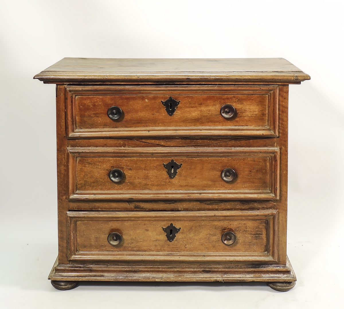 PICCOLO CASSETTONE IN NOCE XVII secolo piano a becco di civetta, tre cassetti con cornici modanate sul fronte dritto, maniglie in bronzo, piedi a palla schiacciata h cm 80x90x44