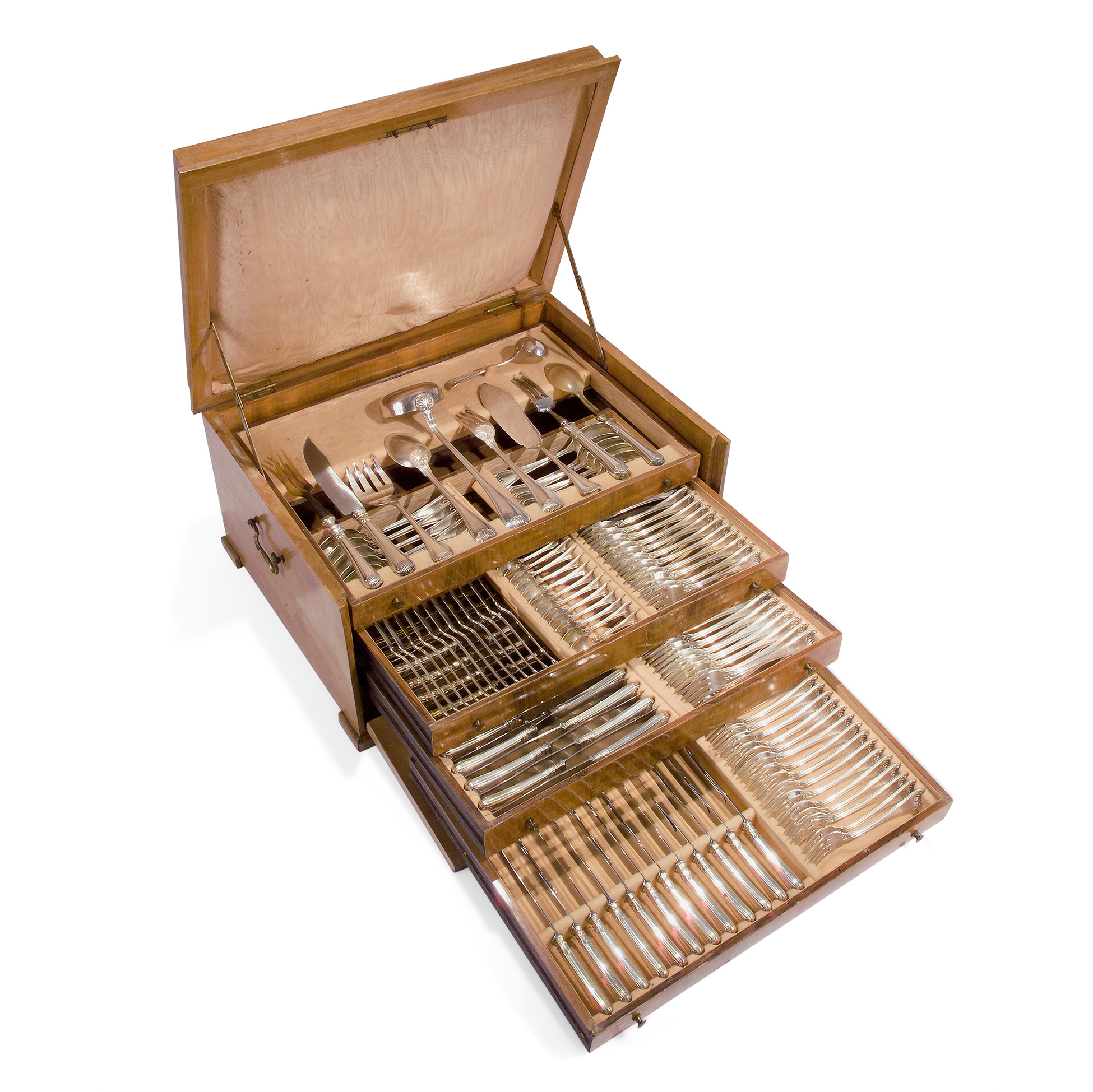 Manufatto da 'Ricci & Co Alessandria ' e conservato nella sua custodia in legno originale, il servizio è composto da 154 pezzi: 10 posate da portata, 48 coltelli, 48 forchette e 11 cucchiai da tavola. 12 cucchiaini da caffè, 12 forchette e 12 coltelli da pesce. Peso complessivo 6500 gr., dimensioni complessive 29.5x56x44 cm.