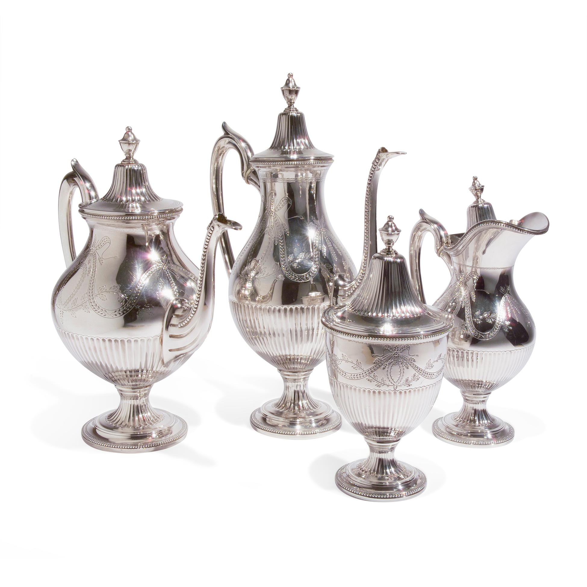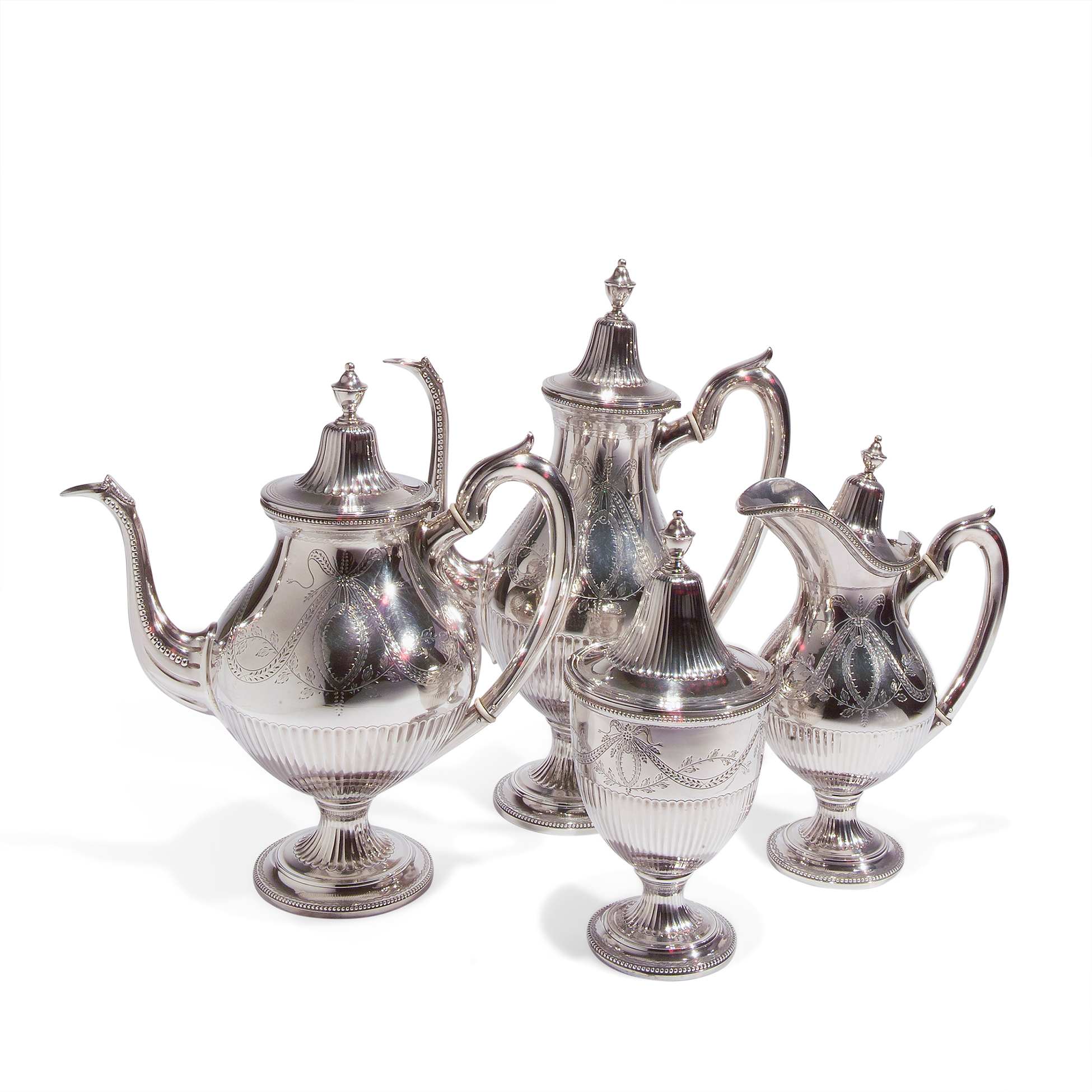 Composto da quattro pezzi: una teiera, una caffettiera, una zuccheriera e una lattiera. Peso complessivo 3488 gr., dimensioni complessive max 34x27x16 cm.