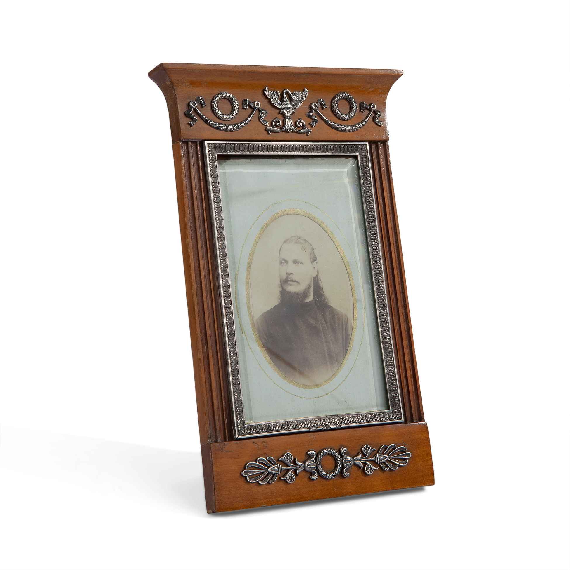 Previous Lot 217 Next Telearte - Piazzale Ammiraglio Bergamini 10, 00136 Roma Silver Wonderland Silver Wonderland - Seconda Sessione Thursday 1 December 2022 hours 16:00 (UTC +01:00) Cornice in legno e argento Fabergé, 1900 circa Dimensioni complessive 20.5x13x1 cm.