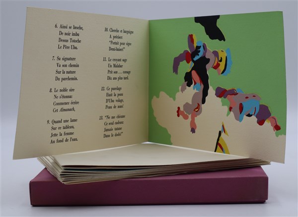 otto serigrafie a colori e una tempera ad illustrazione di un testo di Alfred Jarry