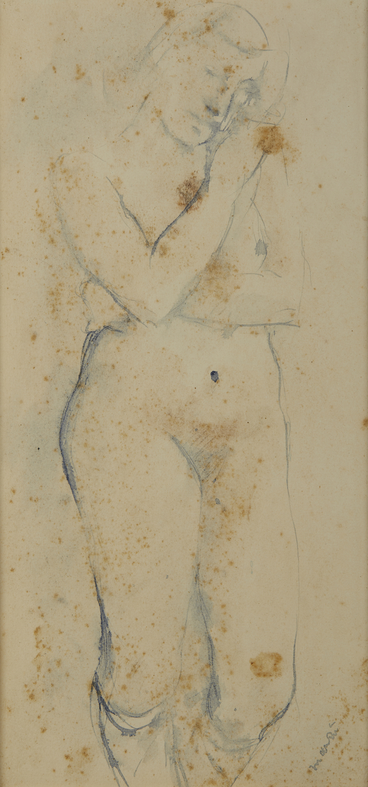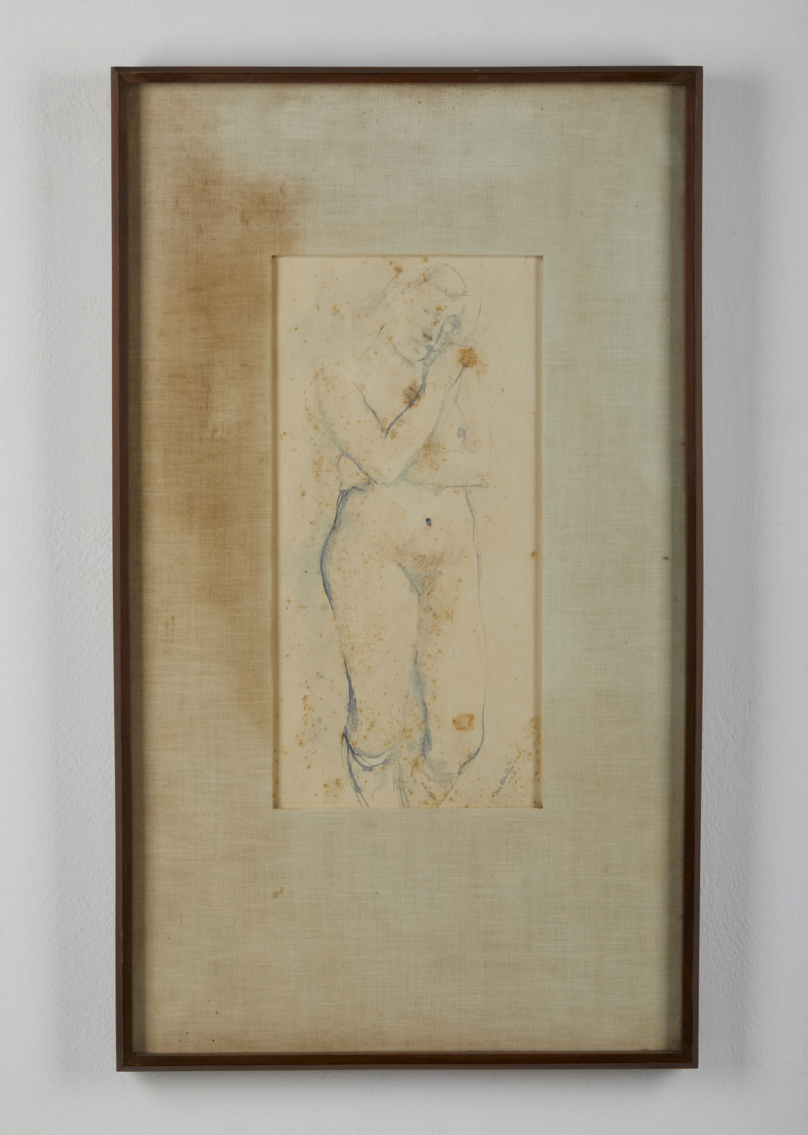 MANZU' GIACOMO (1908 - 1991) Nudo di donna,. 1931. Tecnica mista su carta. Cm 17,00 x 34,50. Firma in basso a destra. Esposizioni: Arte moderna in Italia 1915-1935, Palazzo Strozzi, Firenze, novembre 1966-febbraio 1967. Provenienza: Collezione privata, Bergamo. Difetti. Cornice presente