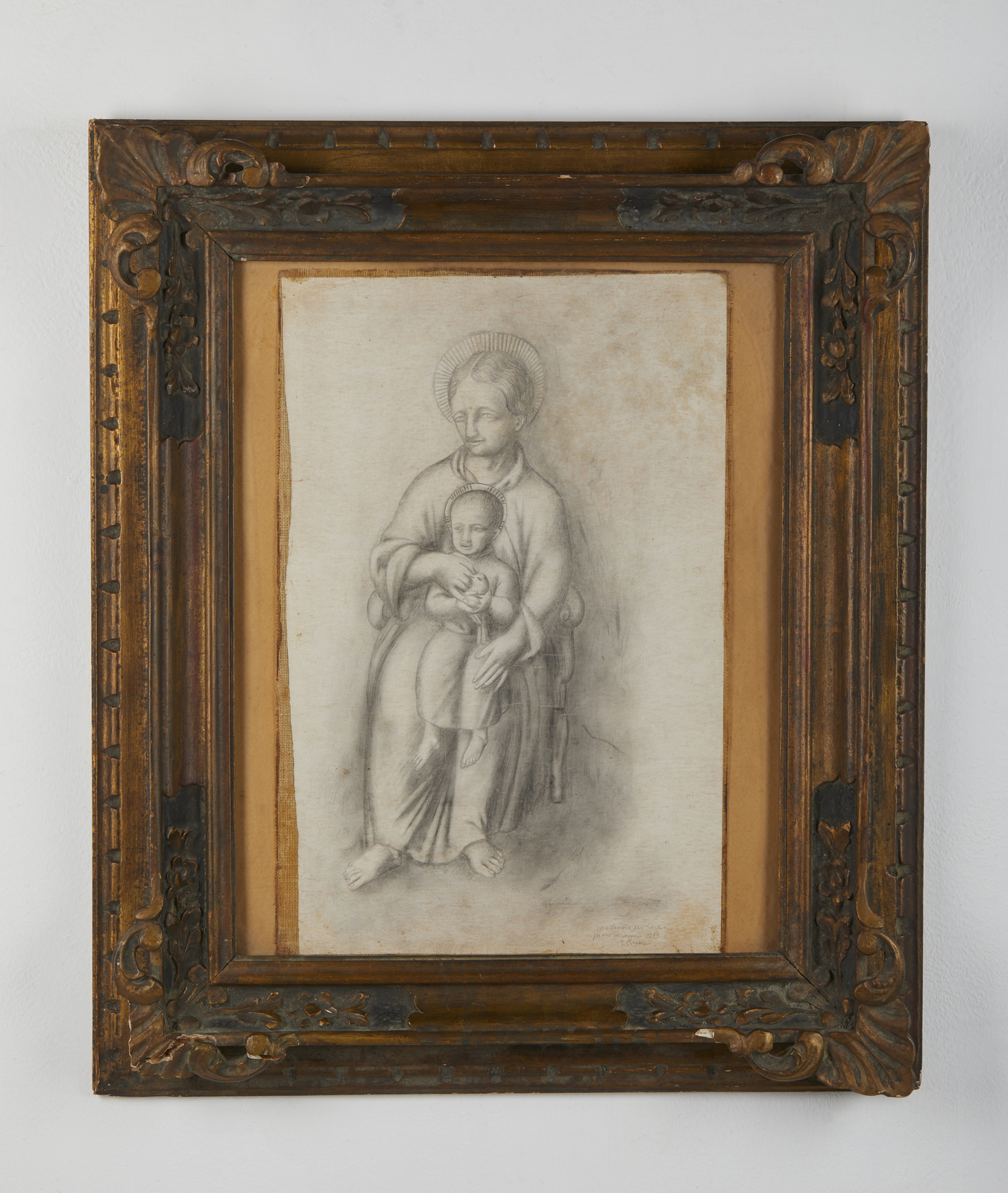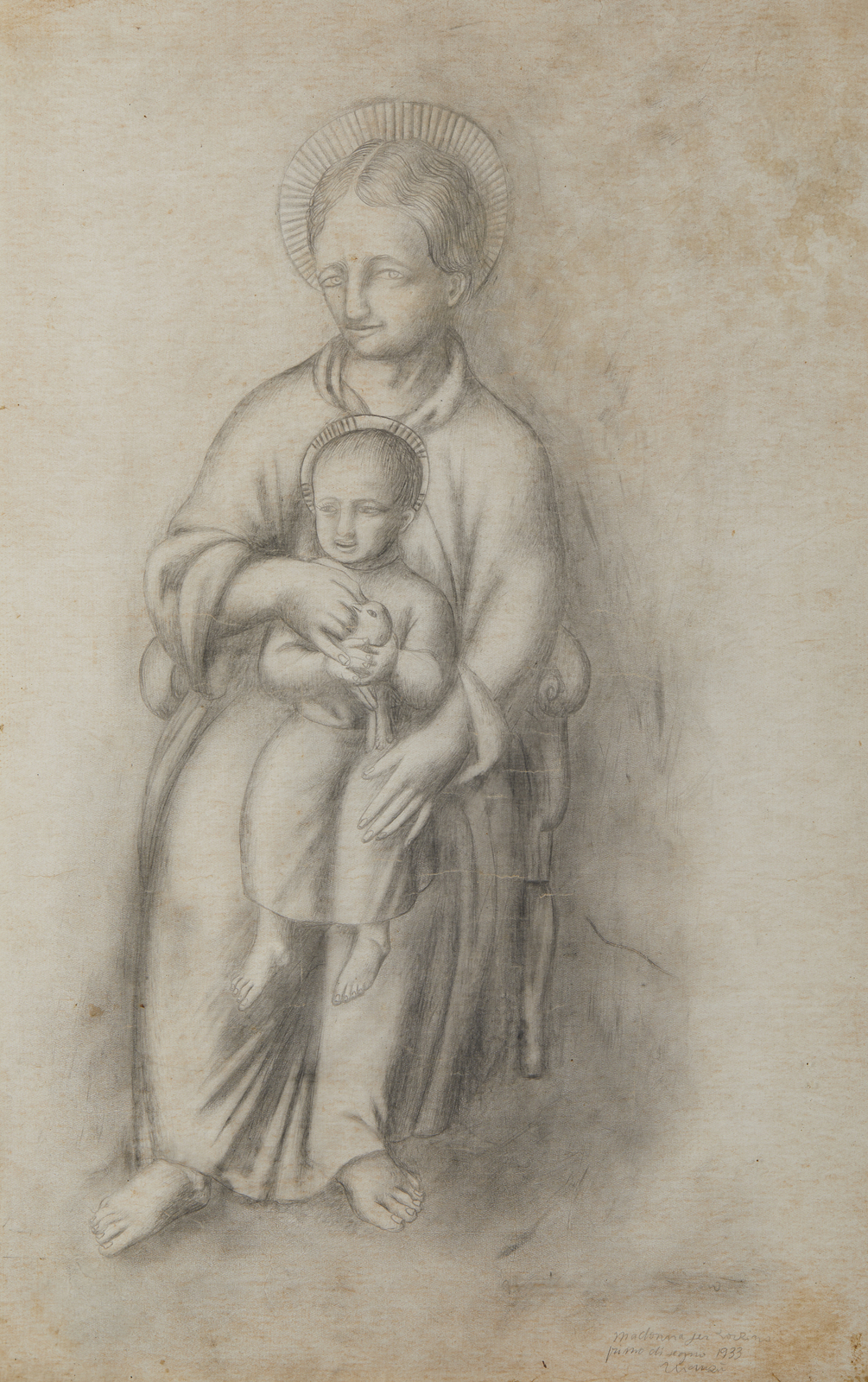 MANZU' GIACOMO (1908 - 1991) Madonna con bambino. 1933. Matita su carta su tela. Cm 29,00 x 47,00. Titolo, firma e anno in basso a destra. Esposizioni: Arte moderna in Italia 1915-1935, Palazzo Strozzi, Firenze, novembre 1966-febbraio 1967. Provenienza: Collezione privata, Bergamo. Lievi difetti. Cornice presente