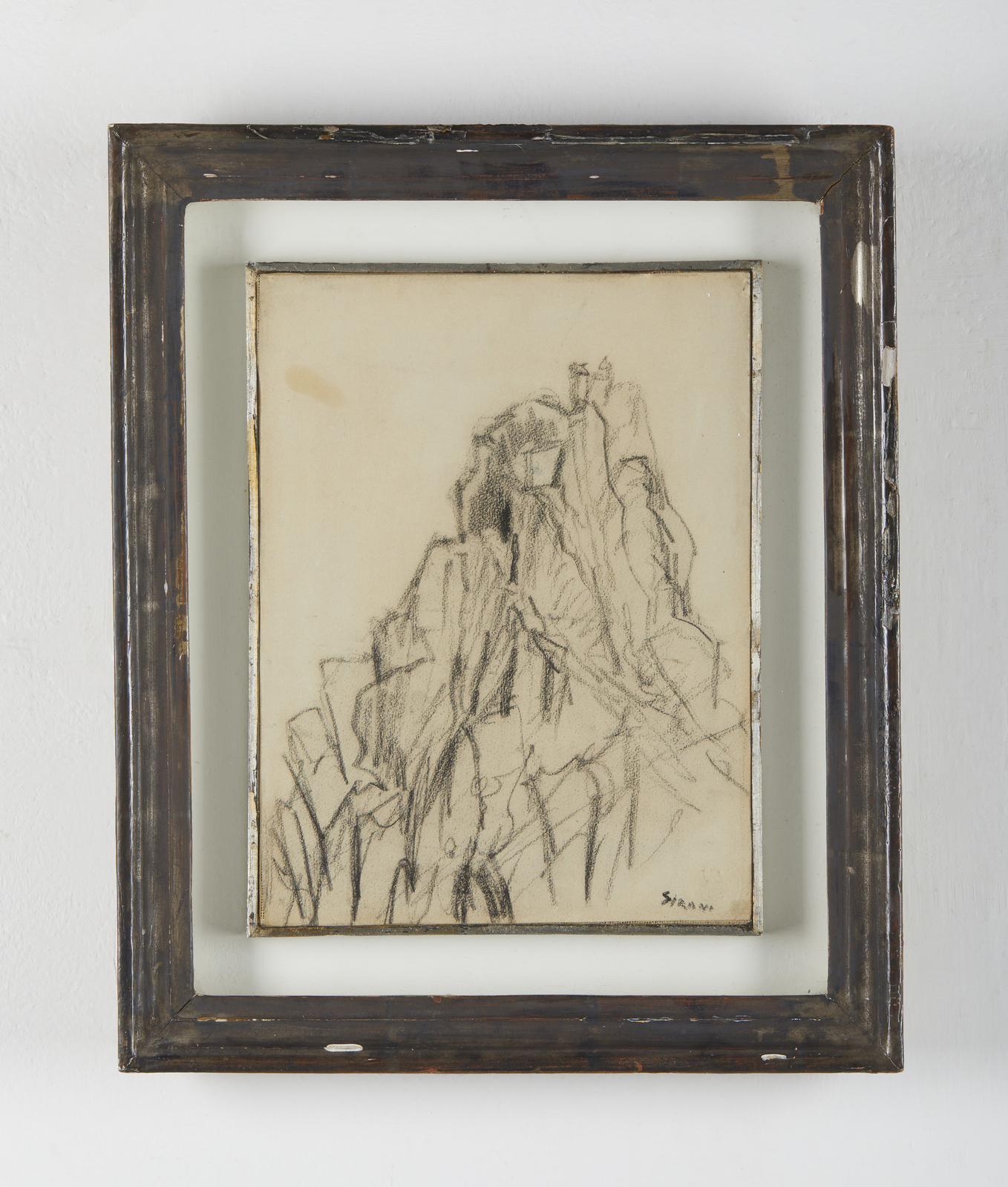 SIRONI MARIO (1885 - 1961) Composizione con Montagne. 1927. Matita grassa su carta. Cm 21,60 x 28,60. Firma apocrifa Sironi in basso a destra. Al retro dichiarazione di autenticità Matilde Sironi e cartiglio descrittivo Galleria Annunciata, Milano. Opera archiviata presso l'Associazione per il patrocinio e la promozione della figura e delle opere di Mario Sironi, Milano, come da documentazione fotografica allegata all'opera riportante il relativo numero d'inventario. Cornice presente