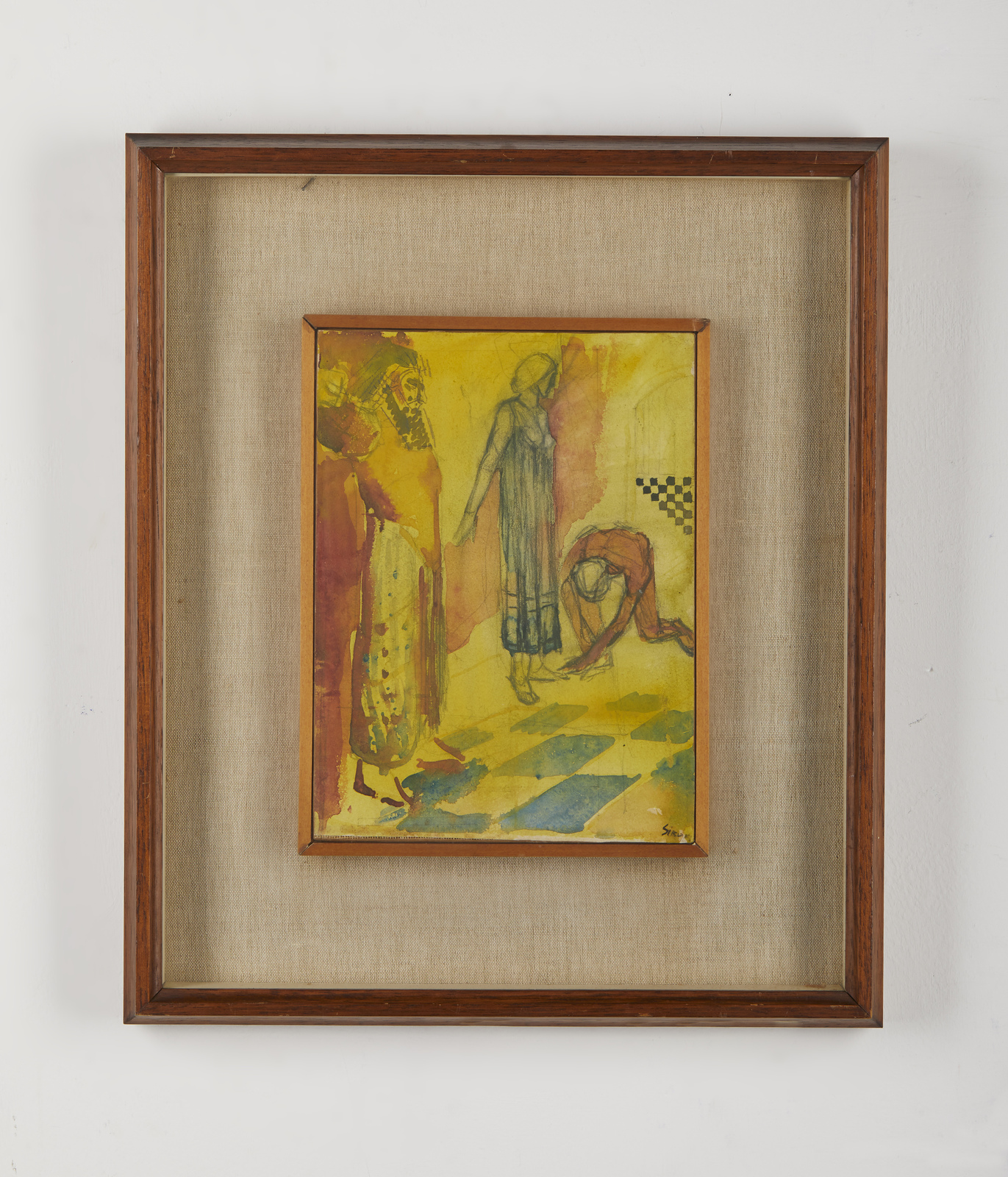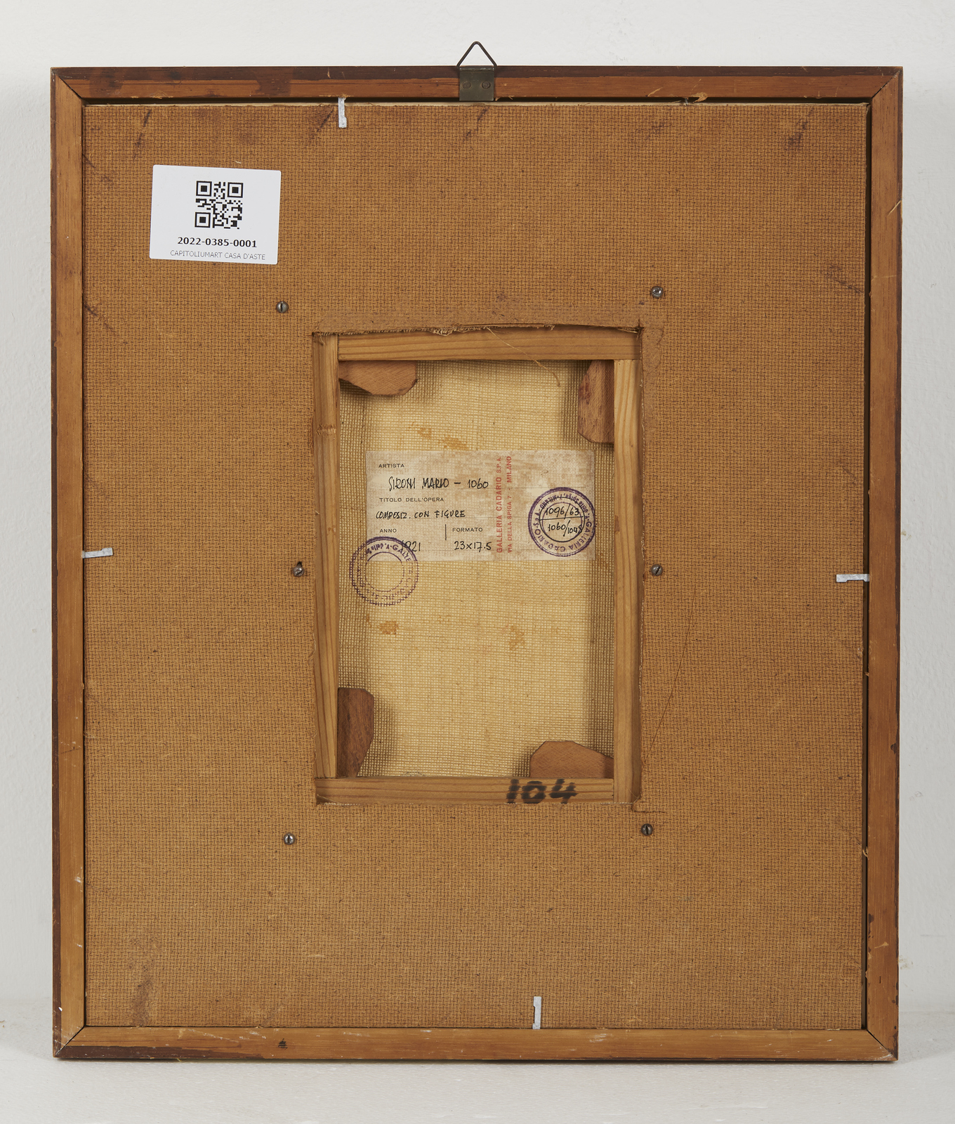 SIRONI MARIO (1885 - 1961) Composizione con figure. . 1921. Tecnica mista su carta incollata su tela. Cm 17,60 x 23,50. Firma apocrifa in basso a destra. Al retro cartiglio descrittivo Galleria Cadario, Milano. Opera archiviata dall’Associazione per il Patrocinio e la Promozione della Figura e dell’Opera di