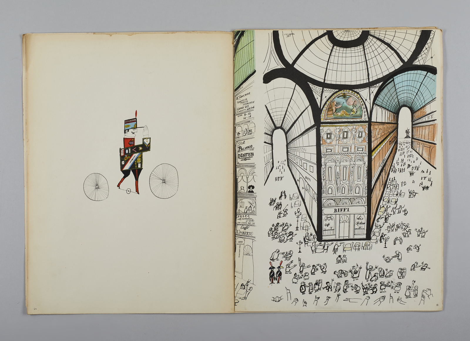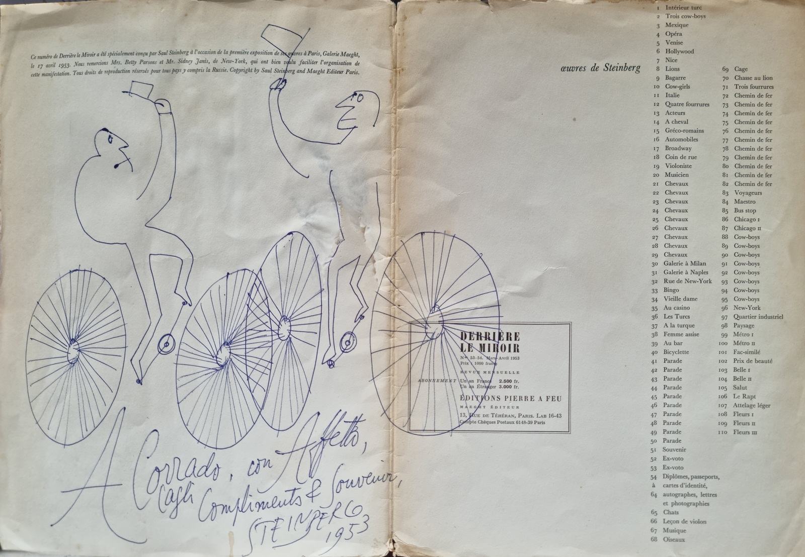 STEINBERG SAUL (1914 - 1999) Derrière le Miroir, n°53-54. . 1953. Rivista con litografie originali e disegno a penna.. Cm 28,00 x 38,00. Lotto costituito da 28 pagine a fogli mobili, per un totale di 22 immagini a pagina intera in quadricromia, tra cui 4 a doppia pagina. Presente disegno a biro con firma, anno e dedica a Corrado Cagli sulla prima pagina. Prima edizione, N. 53 -54. Editions Pierre a feu, Maeght Editeur, Parigi. Questo numero di Derriere le miroir è stato appositamente progettato da Saul Steinberg in occasione della prima mostra delle sue opere alla Galleria Maeght di Parigi il 17 aprile 1953. Edizione totale: 2500 copie non numerate. Difetti.