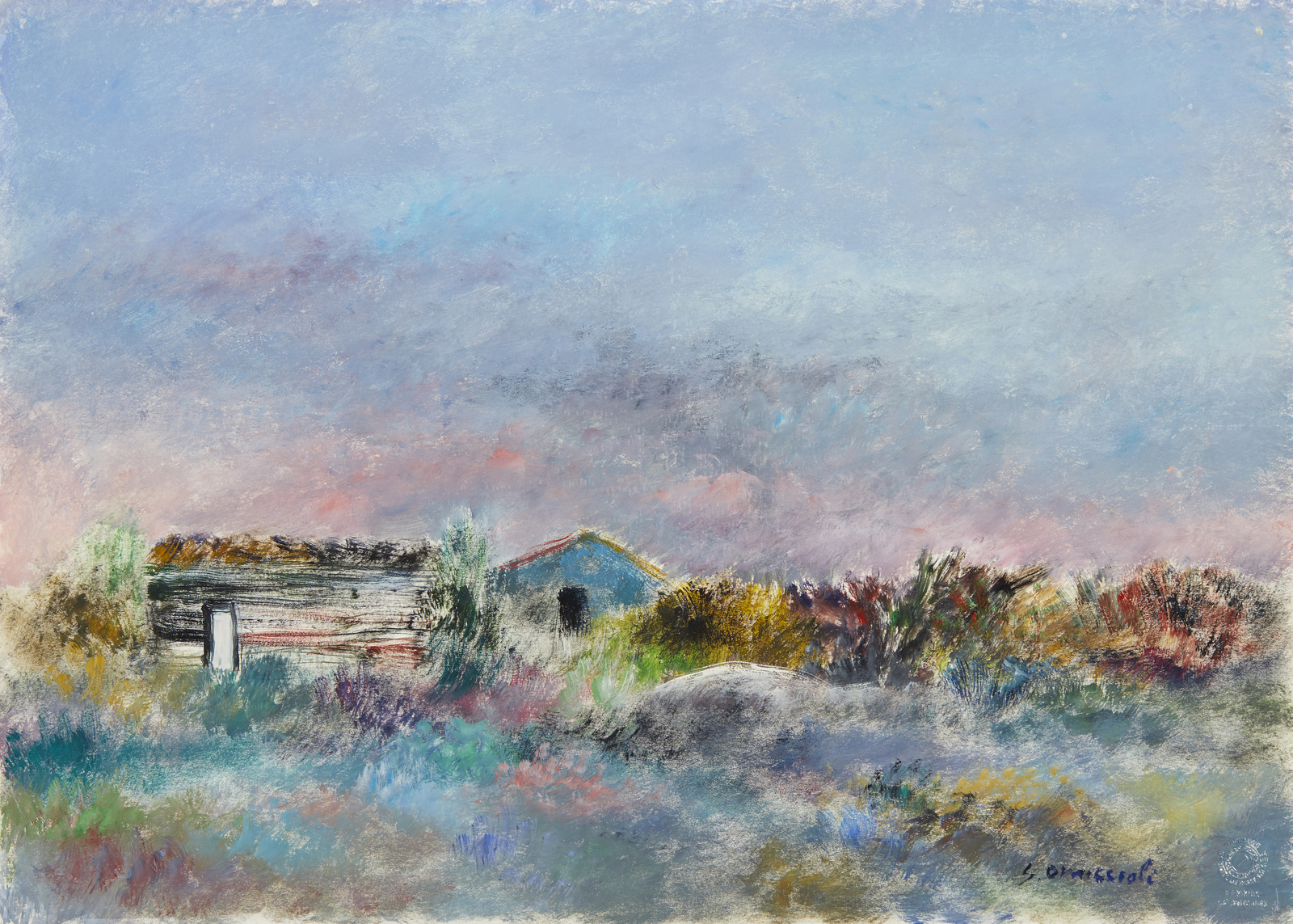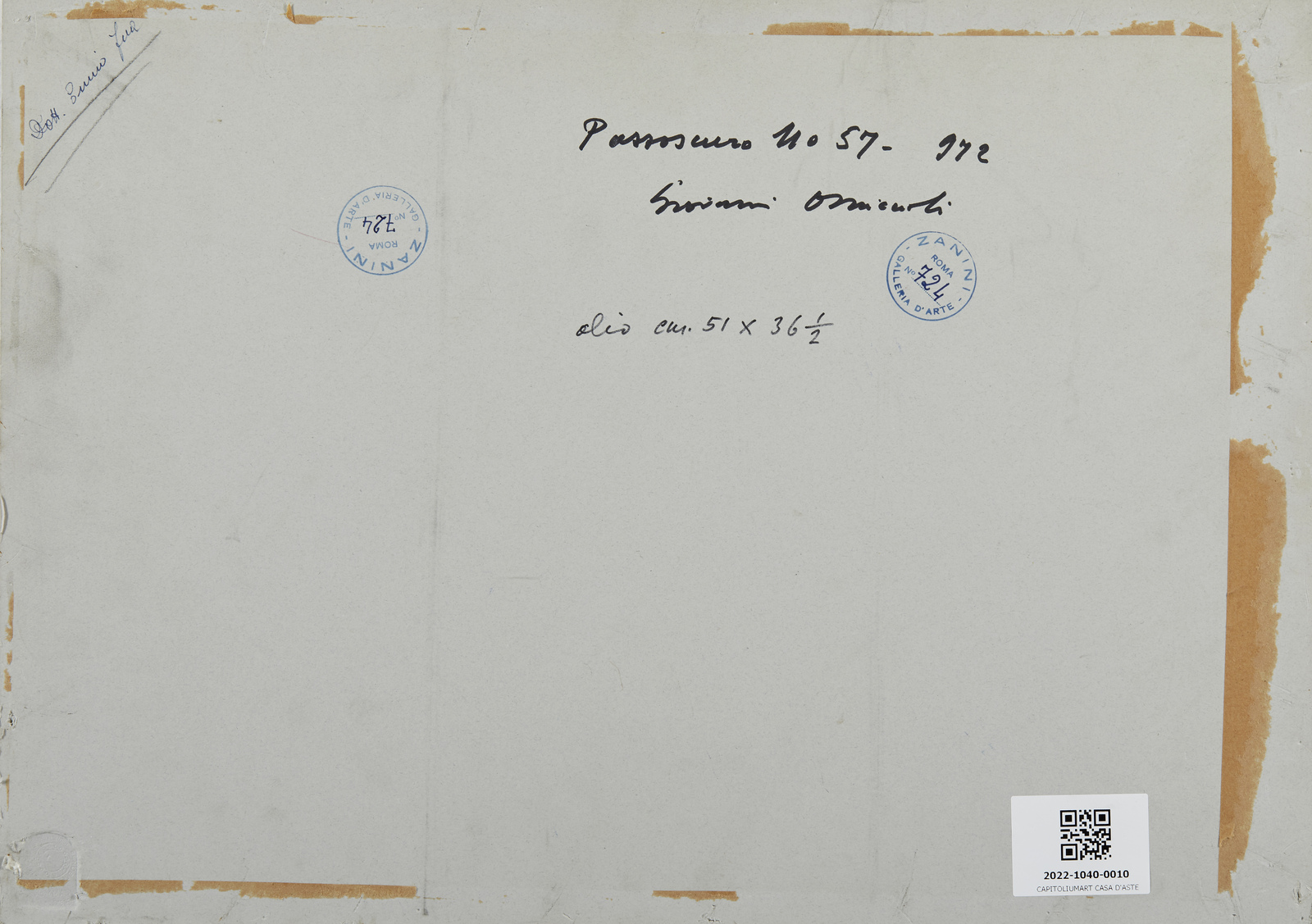 OMICCIOLI GIOVANNI (1901 - 1975) Passoscuro °57. 1972. Olio su cartone. Cm 51,00 x 36,50. Firma in basso a destra. Al retro titolo, firma, anno e timbri Galleria d'arte Zanini, Roma. Autentica dell'artista su fotografia con timbro della Galleria d'Arte Zanini, Roma.