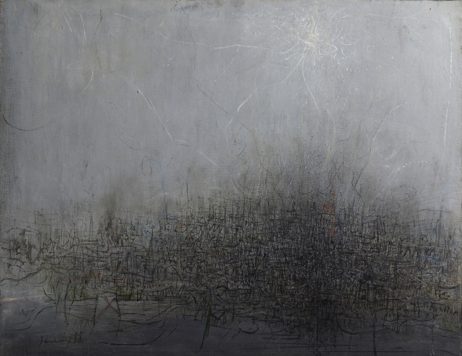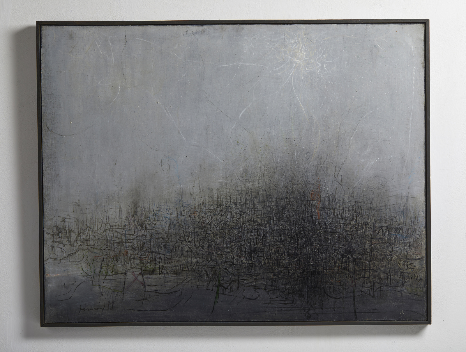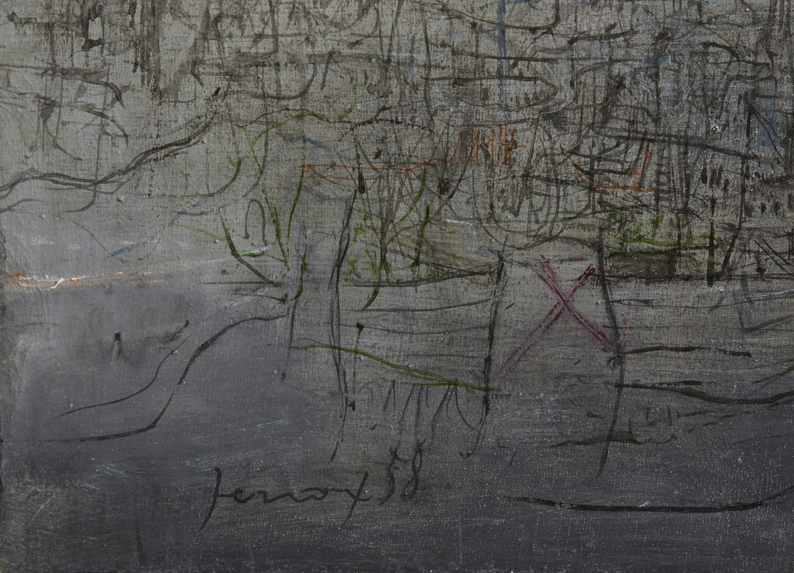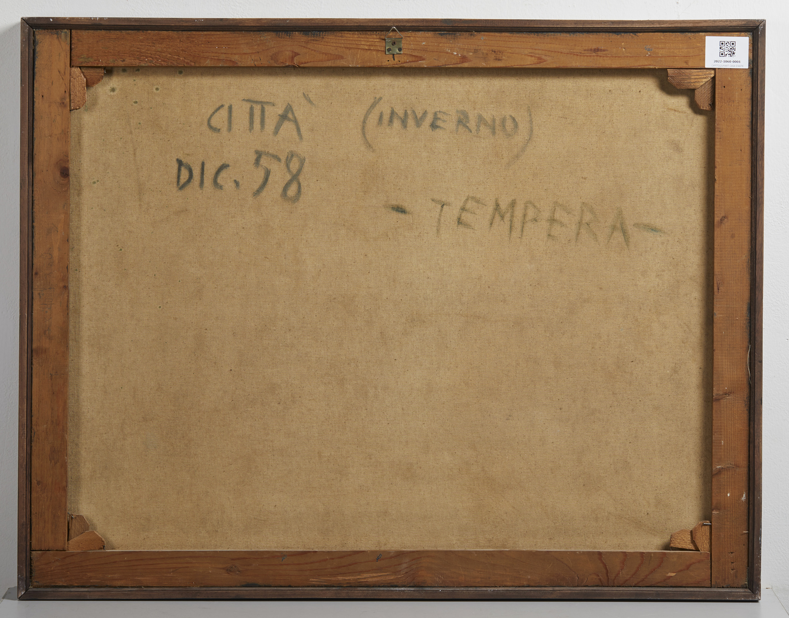 FERRONI GIANFRANCO (1927 - 2001) Città (inverno). 1958. Olio su tela . Cm 90,00 x 70,00. Firma e anno in basso a sinistra. Al retro titolo e anno. Pubblicazioni: Ferroni. La durata della memoria, a cura di C. Gatti e A. Ceribelli, Allemandi Editore, Torino, 2021, tav. 1, p.27. Cornice presente