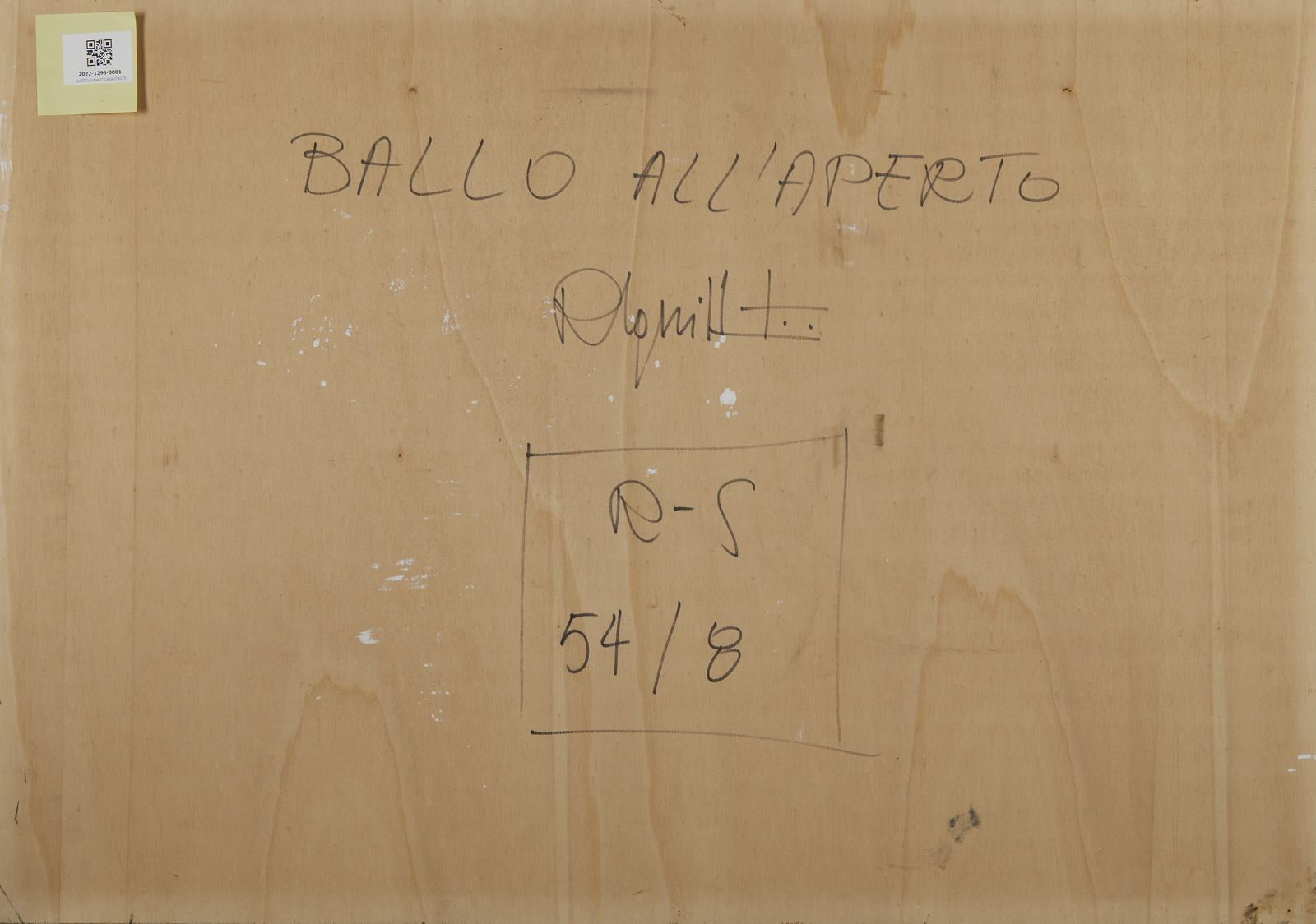 SQUILLANTINI REMO (1920 - 1996) Ballo all'aperto. 1988. Olio su tavola. Cm 100,00 x 70,00. Firma in basso al centro. Al retro titolo e firma. Autentica dell'artista su fotografia. Opera archiviata presso l'Archivio Fotografico Generale delle Opera di Remo Squillantini come da documentazione fotografica allegata all'opera riportante il relativo numero d'inventario. Provenienza: Galleria Parametro, Roma; Collezione privata, Roma. Lievi difetti.