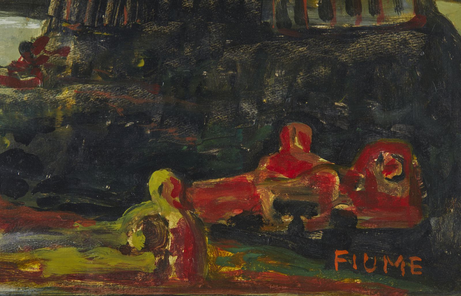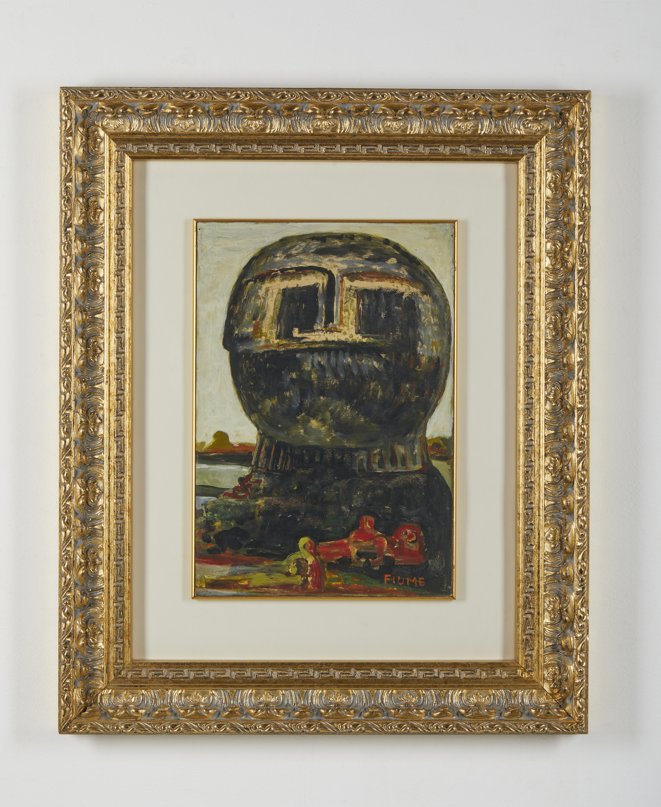 FIUME SALVATORE (1915 - 1997) Isola di pietra. Olio su tavola. Cm 31,00 x 46,00. Firma in basso a destra. Al retro cartiglio descrittivo e timbro Galleria d'arte Cortina, Milano. Autentica su fotografia di Laura Fiume riportante il relativo numero d'inventario. Certificato di provenienza Meeting Art, Vercelli, 2019. Esposizioni: Salvatore Fiume, Galleria d'arte Cortina, Milano, 1968. Anni '60. . Cornice presente