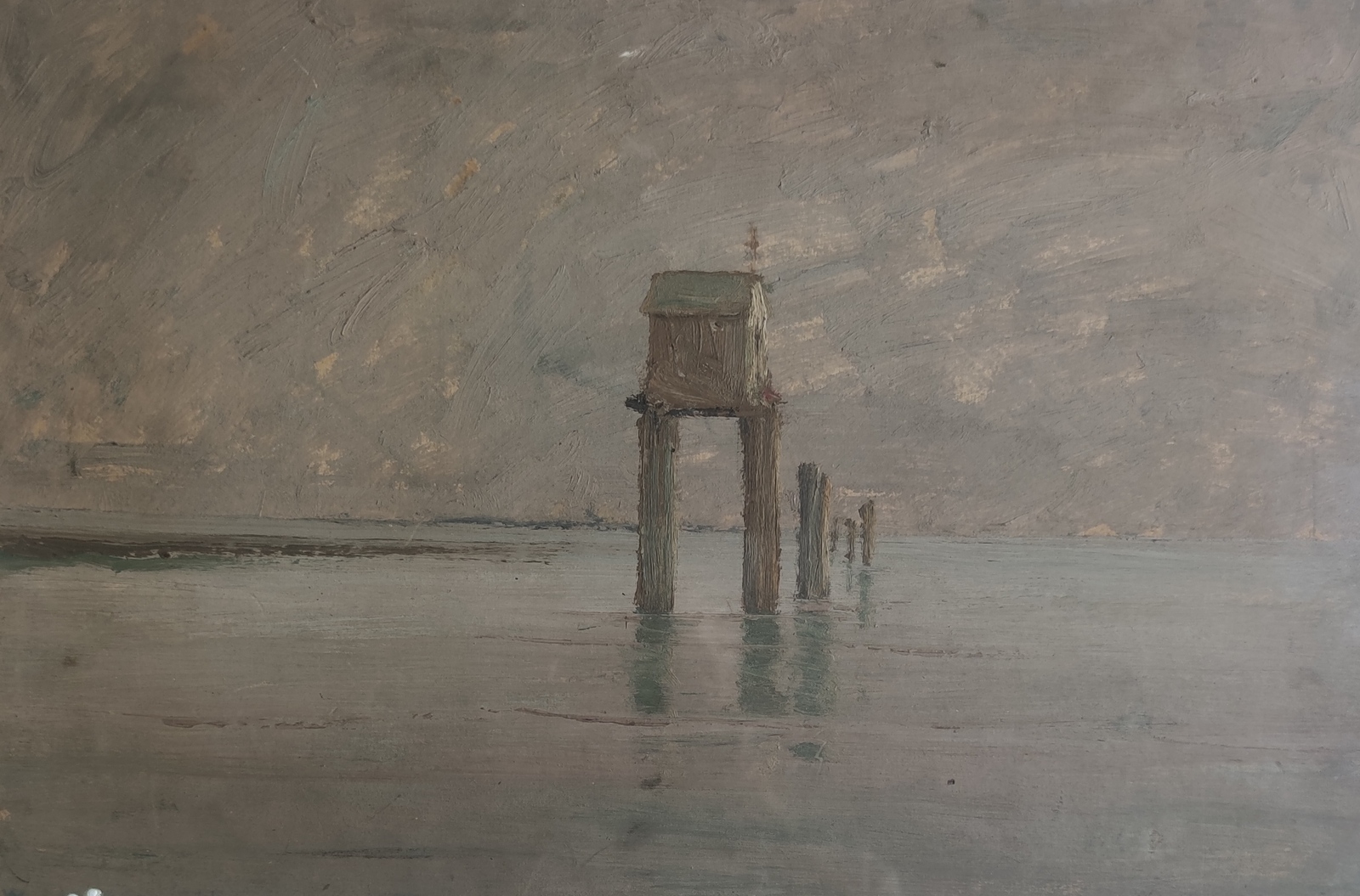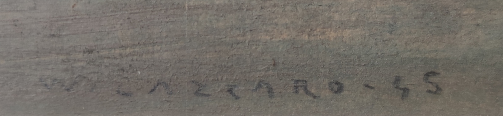LAZZARO WALTER (1914 - 1989) Silente laguna. 1945. Olio su carta applicata su tavola. Cm 49,00 x 32,00. Firma e anno in basso a destra. Firma e titolo in basso a sinistra. Autentica su fotografia di Sandra Lazzaro riportante il relativo numero d'inventario (tecnica errata). Cornice presente