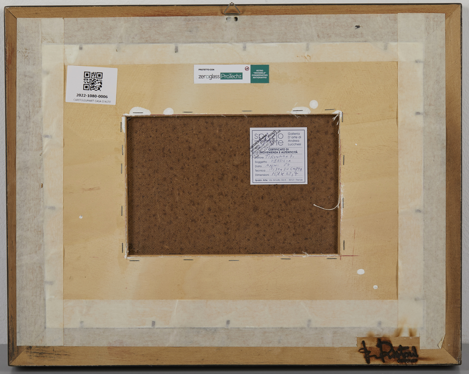 TIRINNANZI NINO GIOVANNI (1923 - 2002) Paesaggio in Versilia. 1958. Tecnica mista su carta applicata su tavola. Cm 23,70 x 16,10. Firma in basso a sinistra. Al retro cartiglio descrittivo della Galleria Spazio Arte, Firenze. Autentica su fotografia di Giovanni Faccenda. Cornice presente