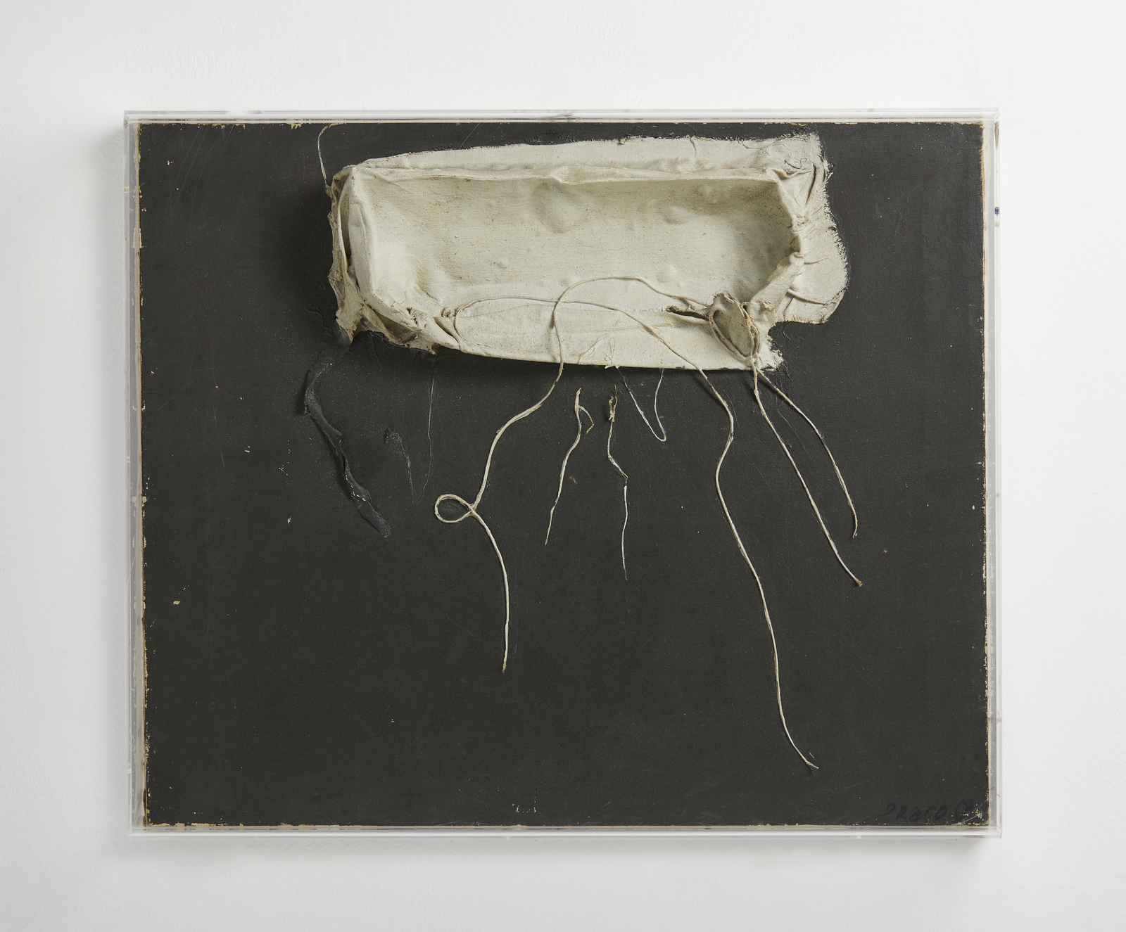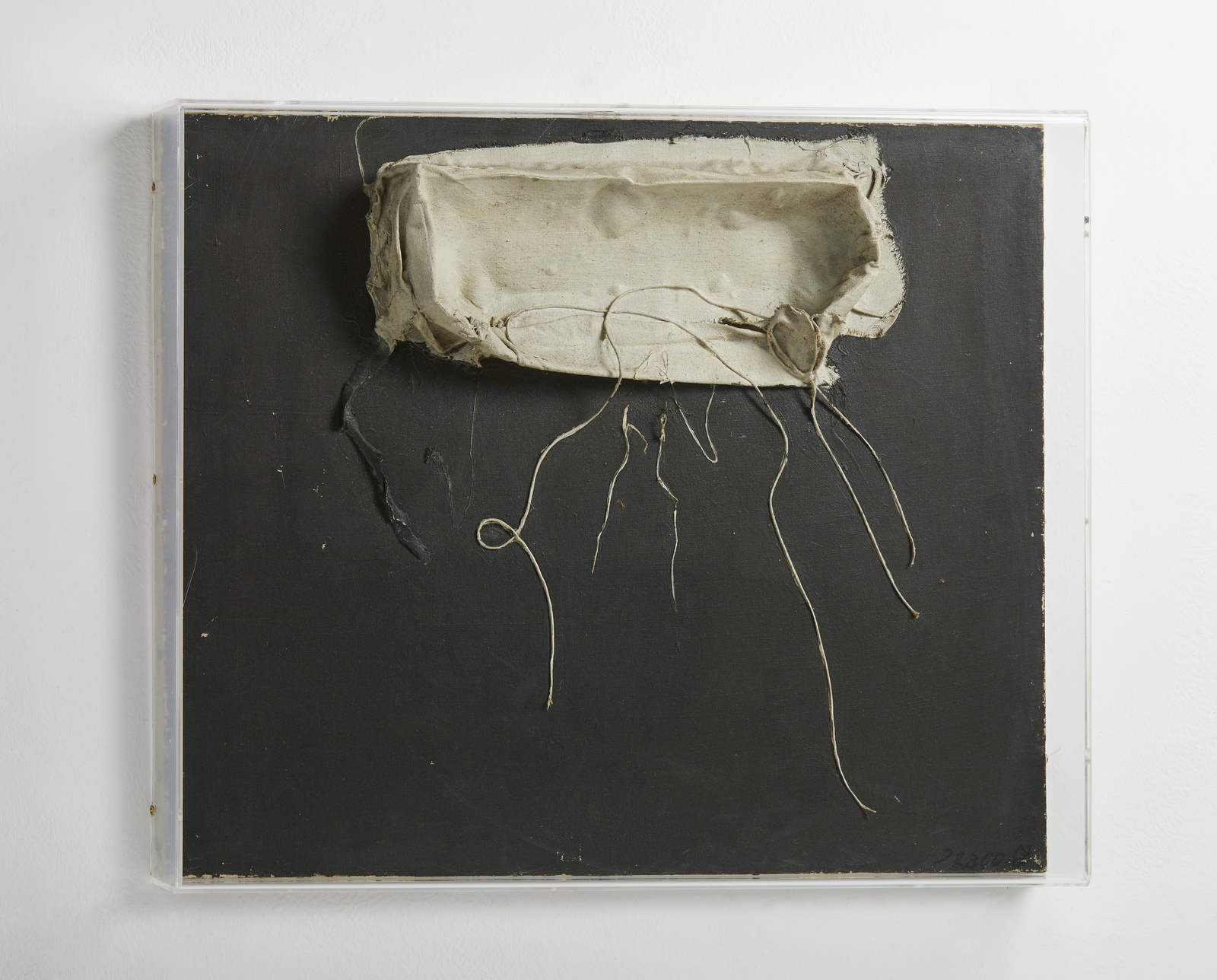 KALAJIC DRAGOS (1943 - 2005) Difesa di una esperienza. 1963. Tecnica mista su tela. Cm 61,50 x 51,50. Firma e anno in basso a destra. Al retro titolo, firma e anno. Difetti. Cornice presente