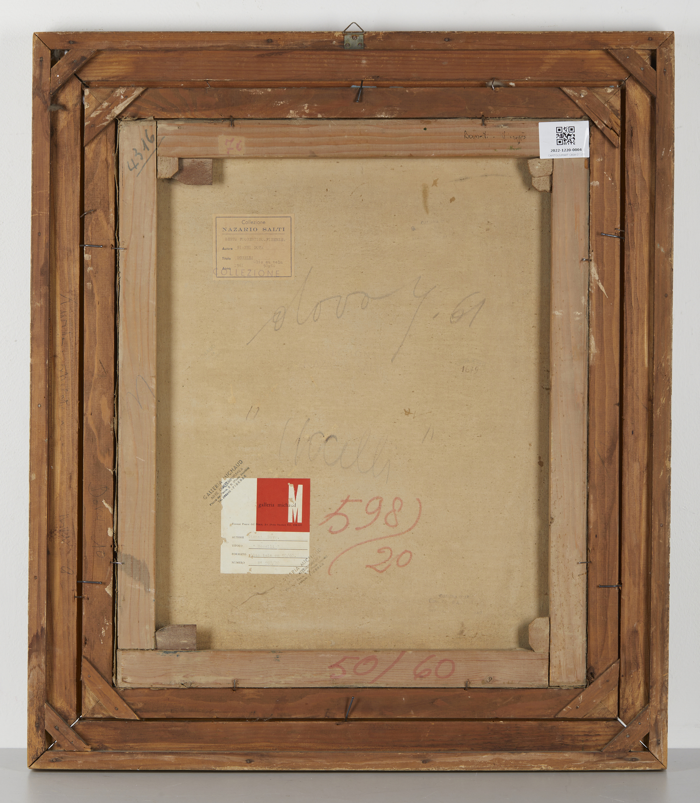 DOVA GIANNI (1925 - 1991) Uccelli. 1961. Olio su tela . Cm 50,00 x 60,00. Firma e anno in basso a sinistra. Al retro titolo, firma, anno, timbro e cartiglio descrittivo Galleria Michaud, Firenze. Provenienza: Galleria Michaud, Firenze; Collezione Narazio Salti, Sesto Fiorentino; Collezione privata. Opera in corso di archiviazione presso l'Archivio Gianni Dova. Lievi difetti. Cornice presente