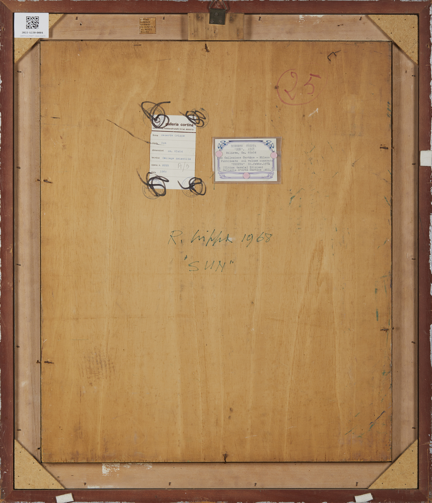 CRIPPA ROBERTO GAETANO (1921 - 1972) Sun. 1968. Tecnica mista e collage su tavola. Cm 54,00 x 65,00. Al retro titolo, firma, anno, timbro e cartiglio descrittivo Galleria Cortina, Milano. Pubblicazioni: Crippa, Edizioni Galleria d'Arte Cortina, Milano, febbraio 1971. Si ringrazia la Galleria Cortina, Milano, per ave confermato la provenienza dell'opera. Provenienza: Galleria Cortina, Milano; Collezione privata. Lievi difetti. Cornice presente