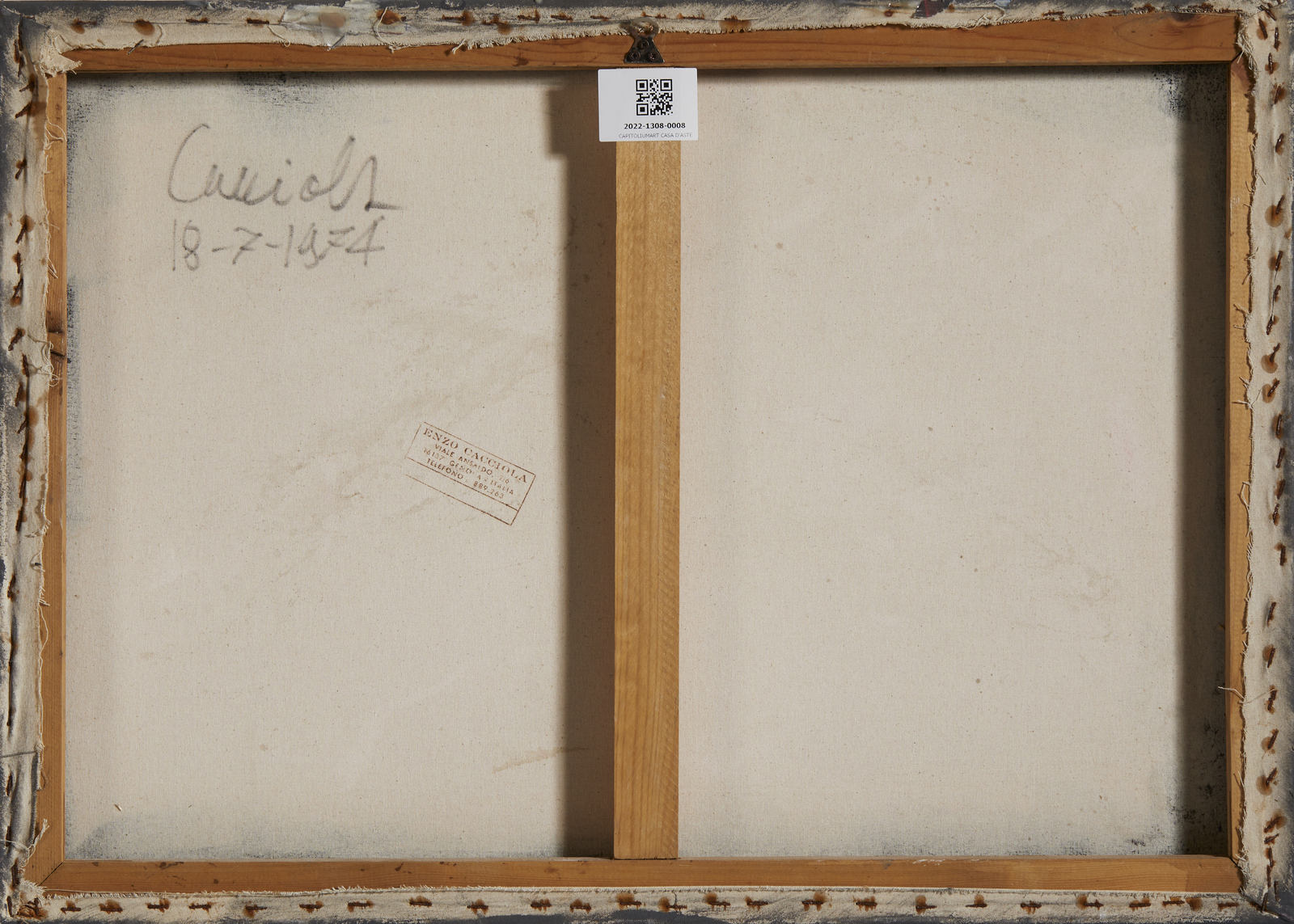 CACCIOLA ENZO (n. 1945) 18-7-1974. 1974. Cemento su tela. Cm 70,00 x 50,00. Al retro titolo, firma e timbro Enzo Cacciola, Genova. Autentica dell'artista su fotografia. Certificato di provenienza Meeting Art, Vercelli, 2021. Cornice presente.
