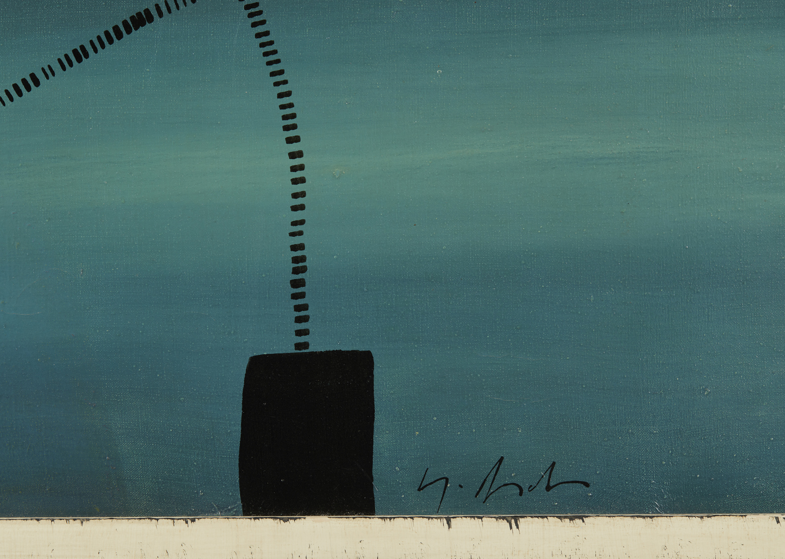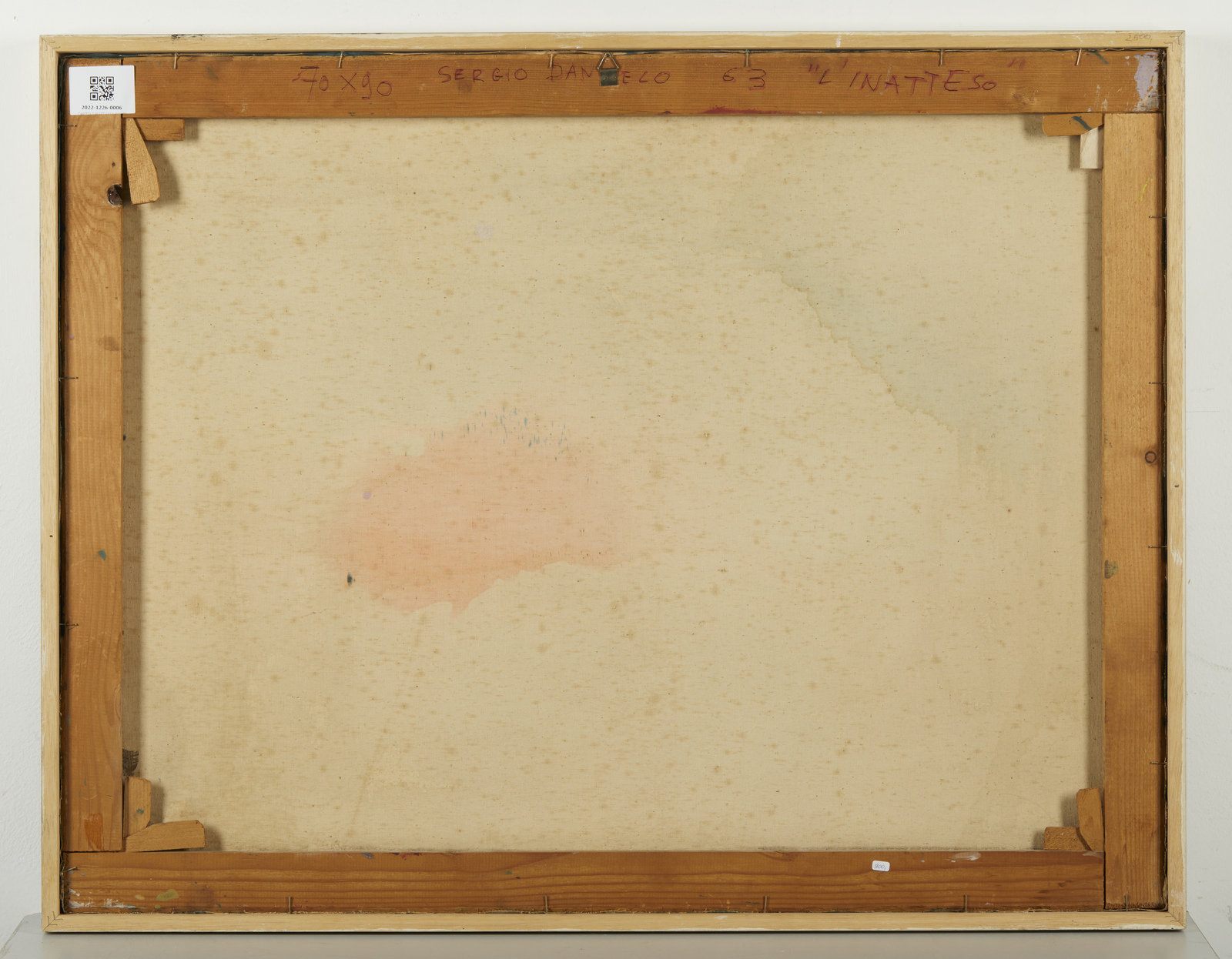 DANGELO SERGIO (n. 1932) L'inatteso. 1963. Olio su tela . Cm 90,00 x 70,00. Firma in basso a destra. Certificato di autenticità su fotografia rilasciato da Galleria d'Arte Niccoli, Parma. Provenienza: Galleria d'arte Niccoli, Parma; Collezione privata. Difetti. Cornice presente