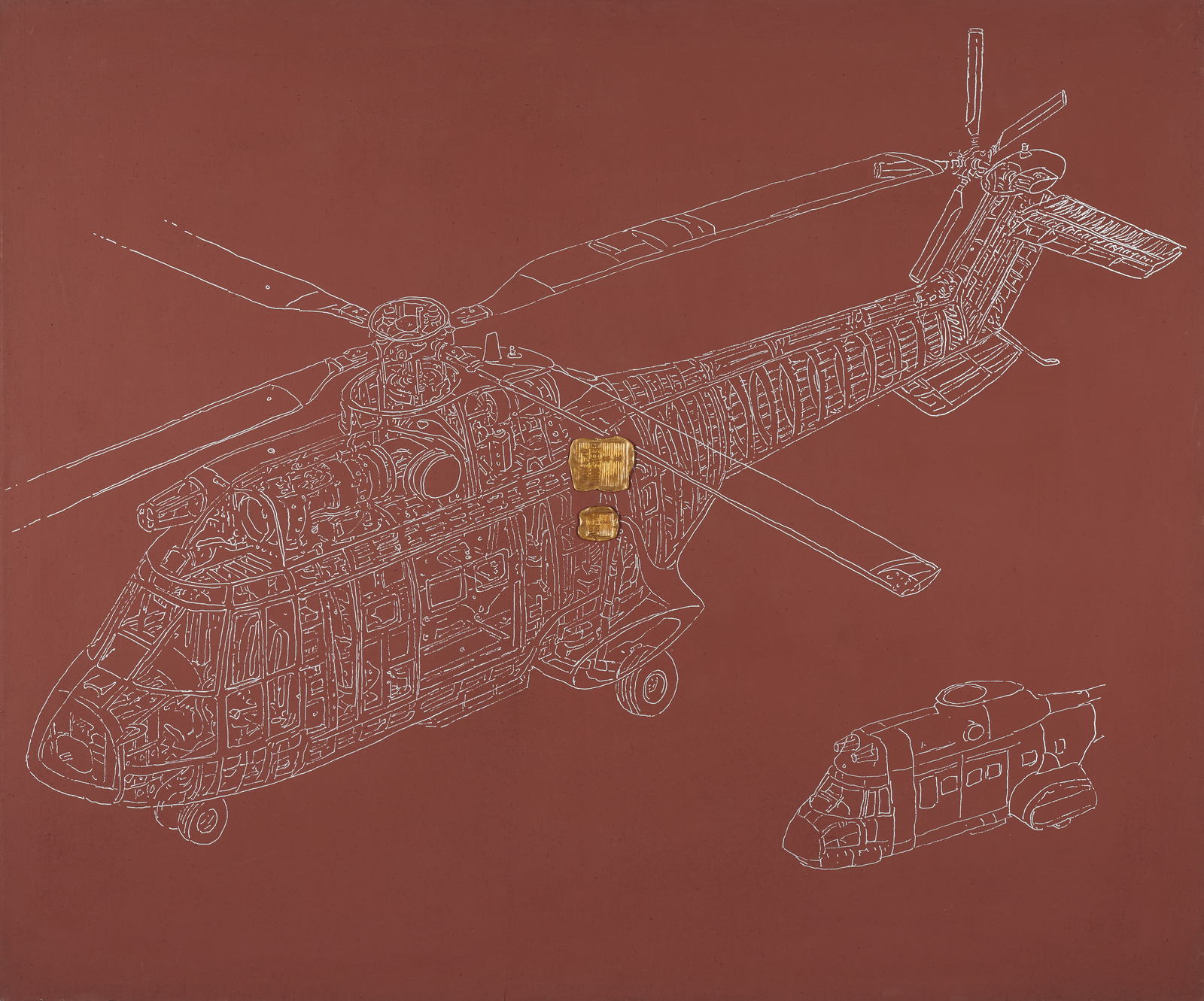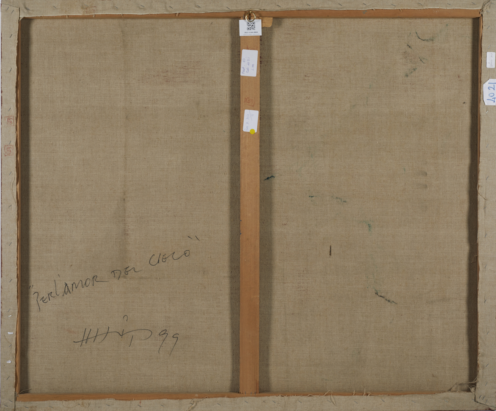 LIM H.H (n. 1954) Per l'amor del cielo. 1999. Tecnica mista e collage su tela. Cm 120,00 x 100,00. Al retro titolo, firma e anno. Lievi difetti.