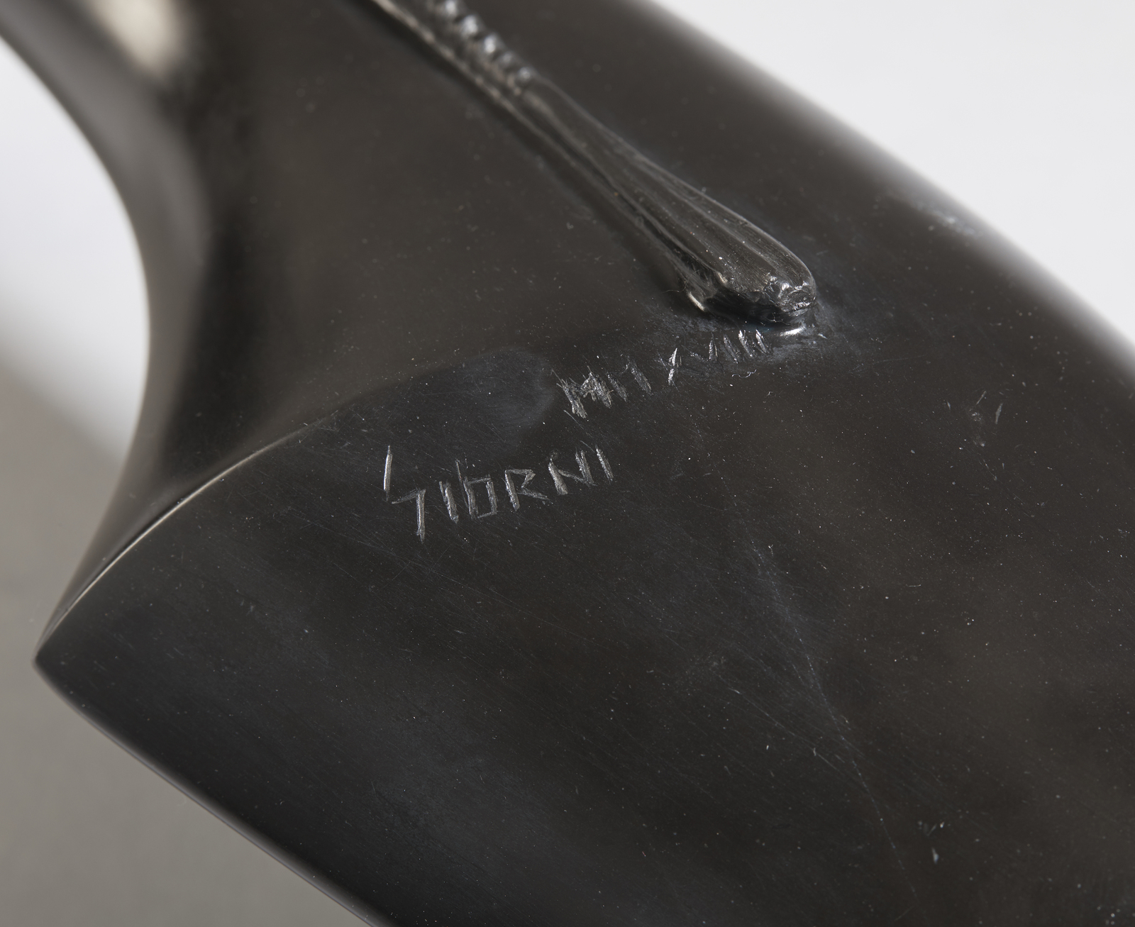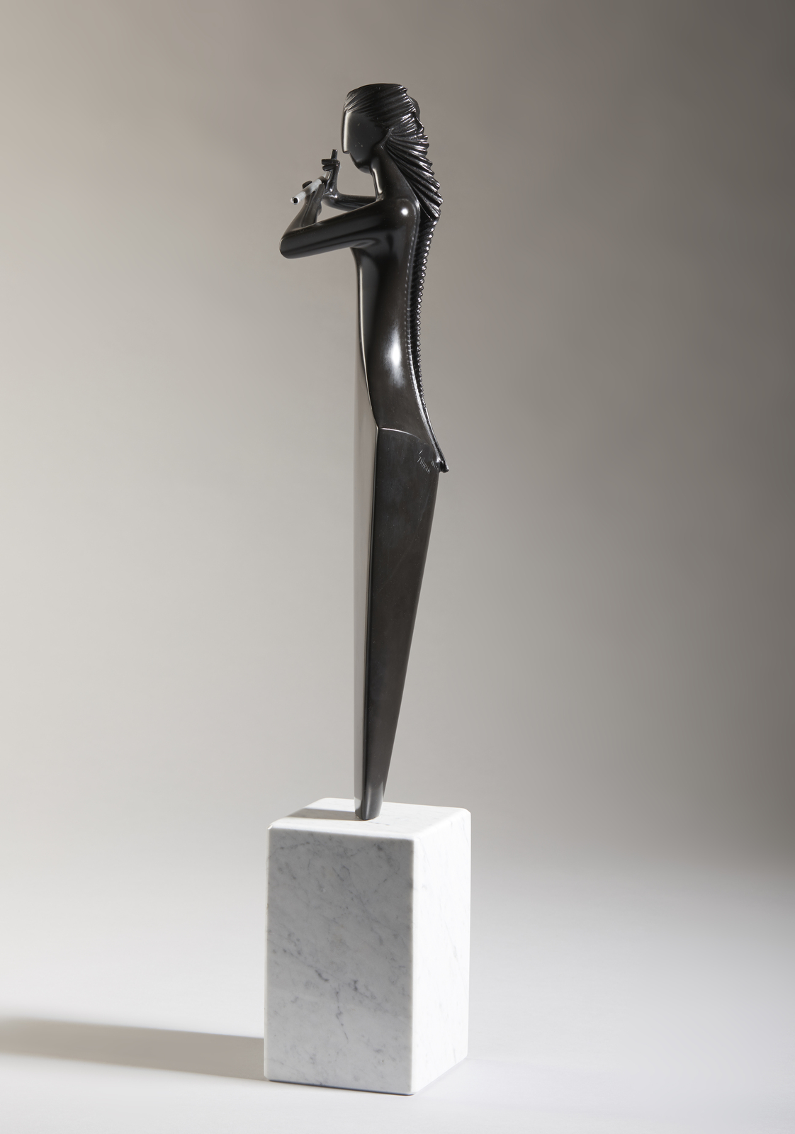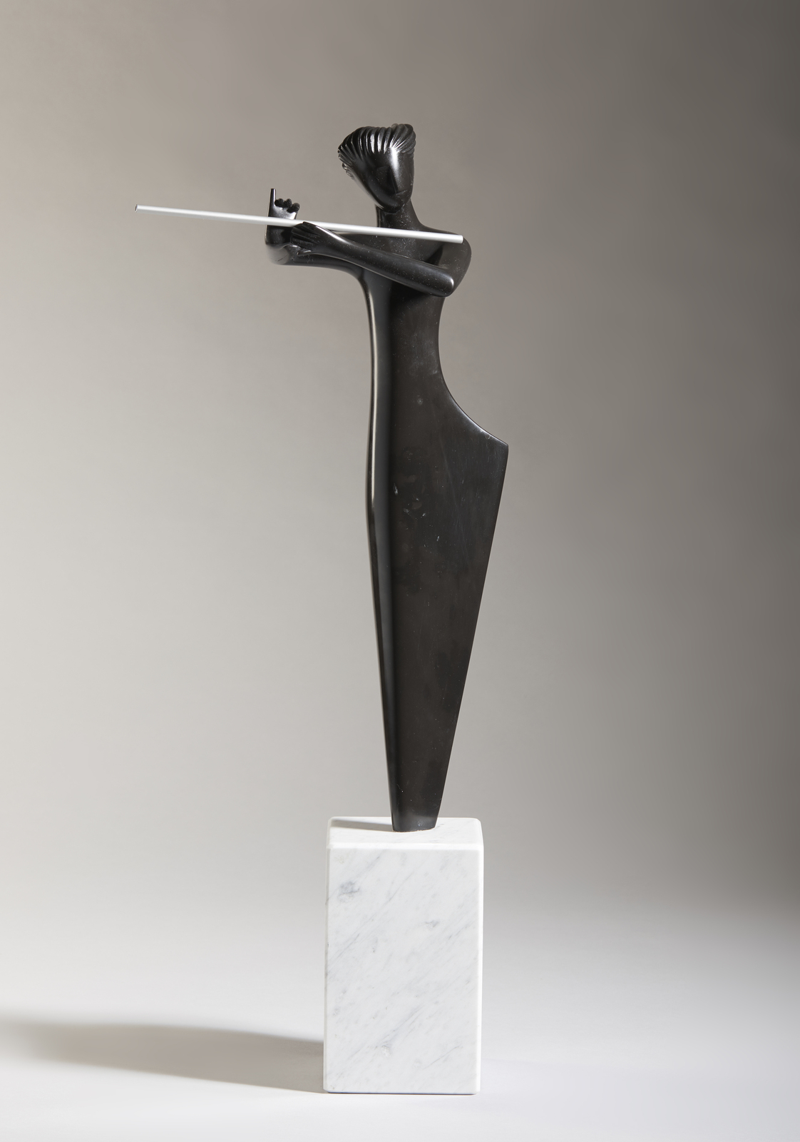 GIORNI GIANFRANCO (n. 1948) Flautista. 2018. Marmo nero.. Cm 11,70 x 53,50. Scultura in marmo nero del Belgio con base in marmo di Carrara. Firma e anno incisi al retro. Dimensioni della base: 19x11,7x11,7 cm. Autentica dell'artista su fotografia, riportante il relativo numero d'inventario.