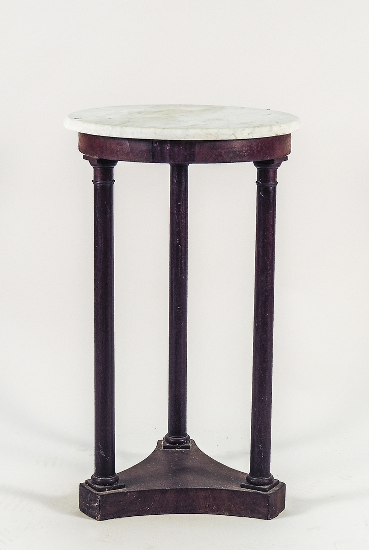 TAVOLINO TONDO DA APPOGGIO XIX secolo tre sostegni a colonna, piano in marmo, difetti, h cm 76, diam cm 44