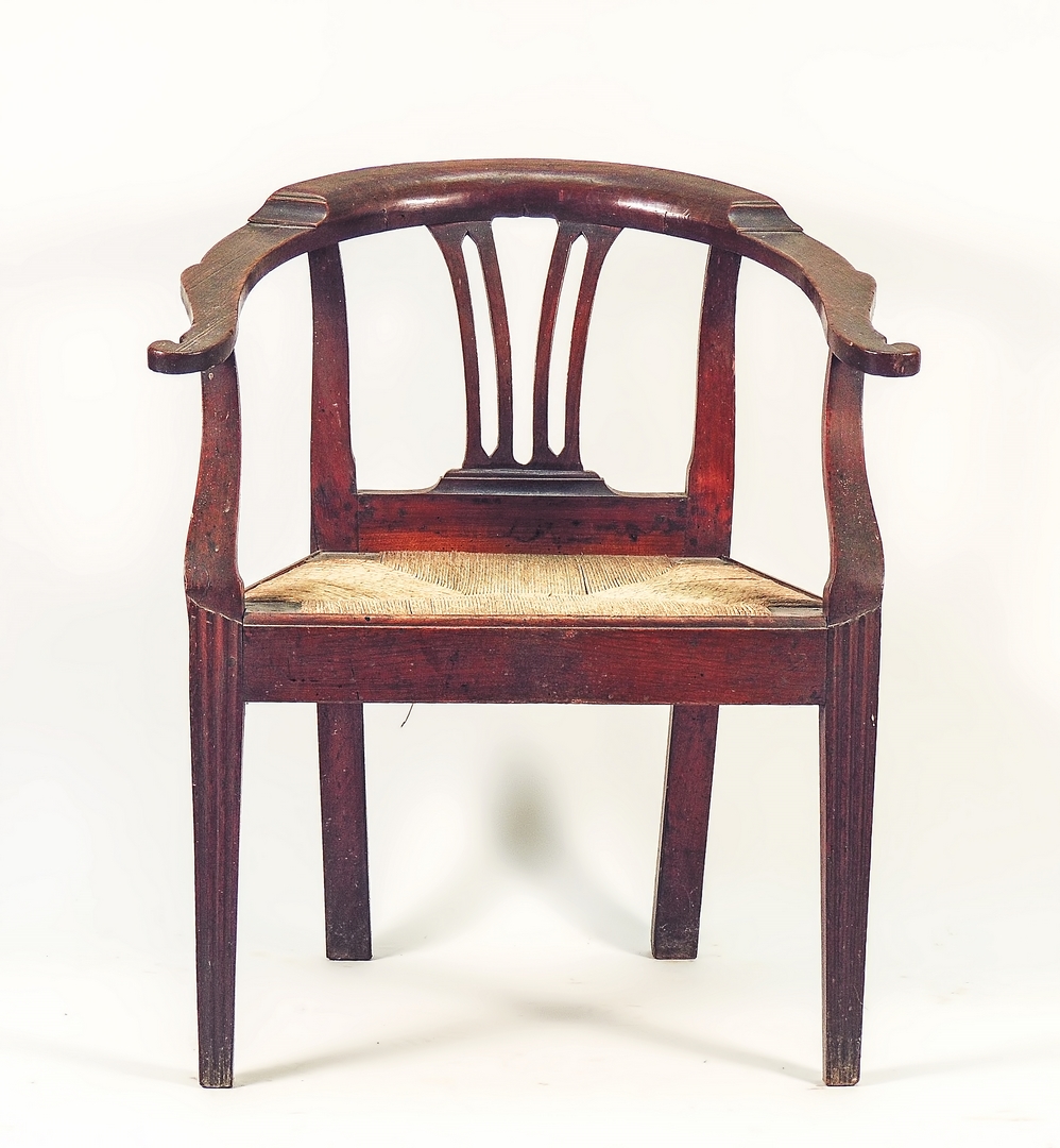 POLTRONCINA A POZZETTO IN NOCE metà del XIX secolo schienale con cartella intagliata a stecche, braccioli a giorno con finale a ricciolo, gambe a faretra scanalate, sedile impagliato
