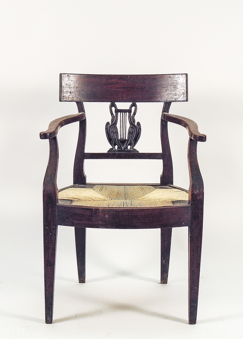 POLTRONCINA IN NOCE prima metà del XIX secolo schienale con cartella intagliata a lira, braccioli a giorno, gambe a sciabola, sedile impagliato