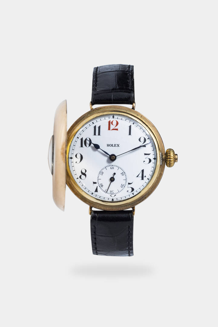 Cassa in oro 9 Kt con fondello a cerniera e particolare protezione del vetro denominata occhio di bue. Quadrante in porcellana con numeri Breguet smaltati. Presenti le iniziali "W&D", tipico degli orologi prodotti al tempo della nascita di Rolex e sono le iniziali dei due fondatori Wilsdorf & Davis.