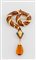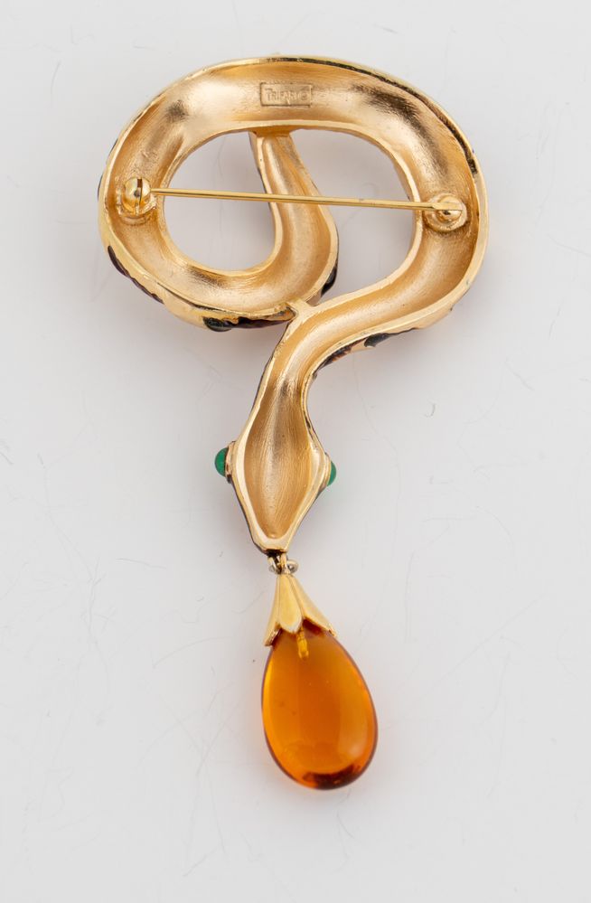 TRIFARI Spilla a forma di serpente con pendente in metallo dorato e dettagli in smalto e pietre sintetiche. Cm 9,3x4,3x1,5. Al retro reca marchio Trifari. (Lievissimi difetti)