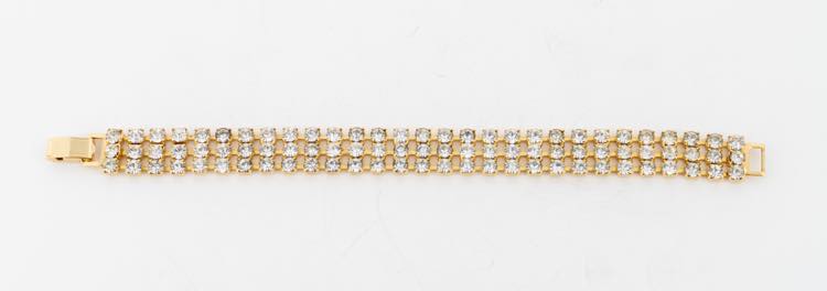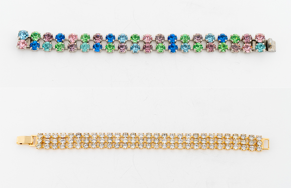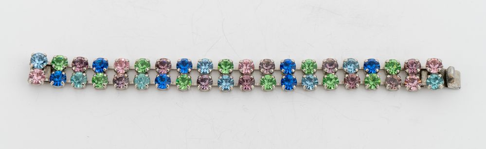 ANONIMO Lotto composto da una coppia di bracciali: uno in metallo dorato con zirconi e l'altro in metallo argentato con pietre colorate. Cadauno cm 18,5x2 e cm 19x1,5. Uno non presenta marcho evidenti e uno reca marchio 53. (Lievi difetti)