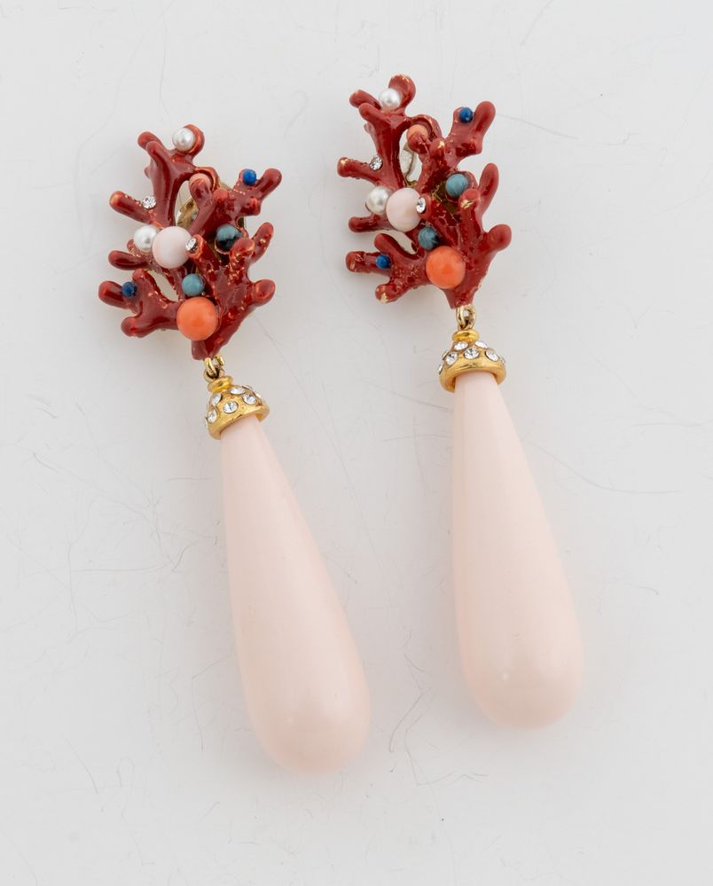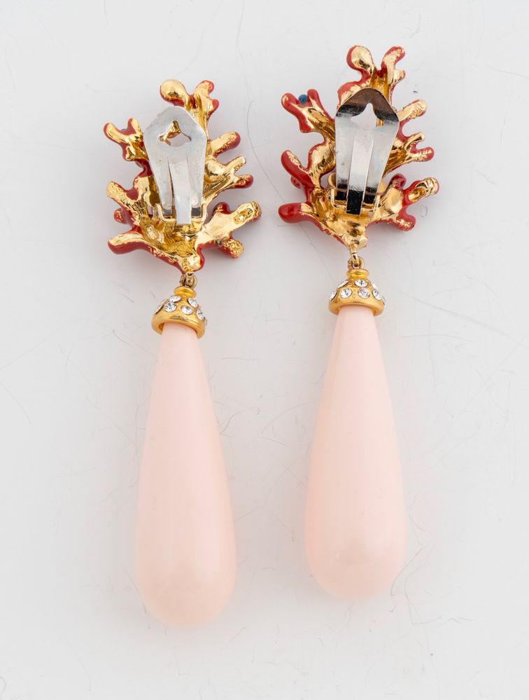 CARLO ZINI Orecchini pendenti a clip in metallo dorato, smaltato e decorato di pietre sintetiche a forma di corallo. Cm 9 cadauno. Al retro recano marchio Zini. (Lievi difetti)