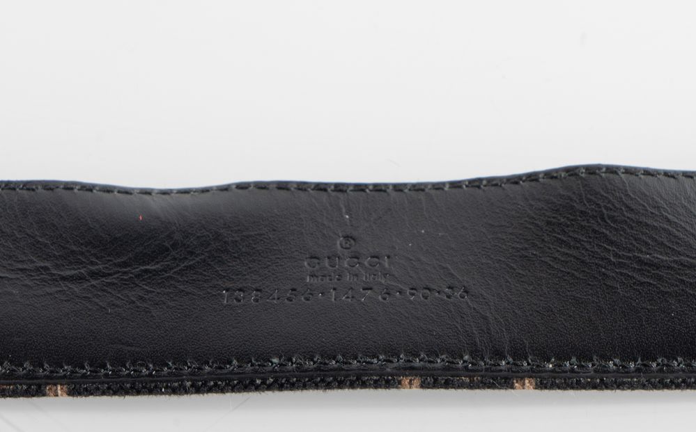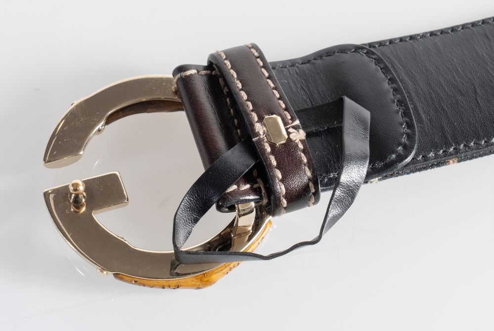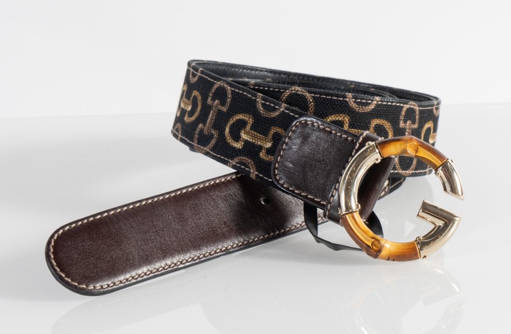 GUCCI Cintura in tela a fantasia horsebit sui toni del blu e del marrone con fibbia in metallo argentato e bamboo. Lunghezza totale cm 105. Fascia: spessore cm 4. Fibbia: cm 6x6. Reca marchio G, Gucci Made in Italy e codice di riferimento prodotto. Corredata di dustbag originale. (Lievi difetti)