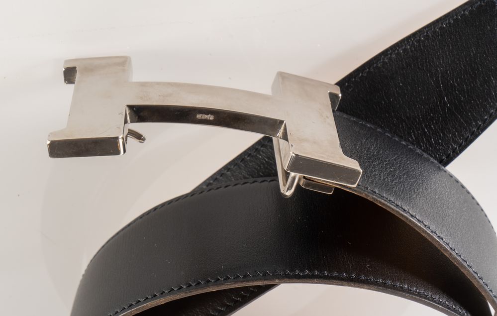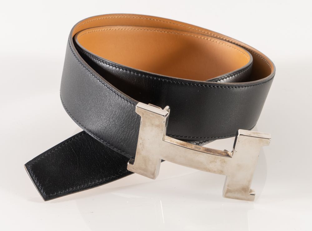 HERMÈS Cintura "H" in pelle nera con interno in pelle color cammello e fibbia in metallo argentato. Riporta taglia 85. Lunghezza totale cm 90. Spessore: cm 4. Fibbia: cm 5x8. Reca marchi Hermès, Hermès Paris Made in France e codice di riferimento prodotto. (Lievi difetti)