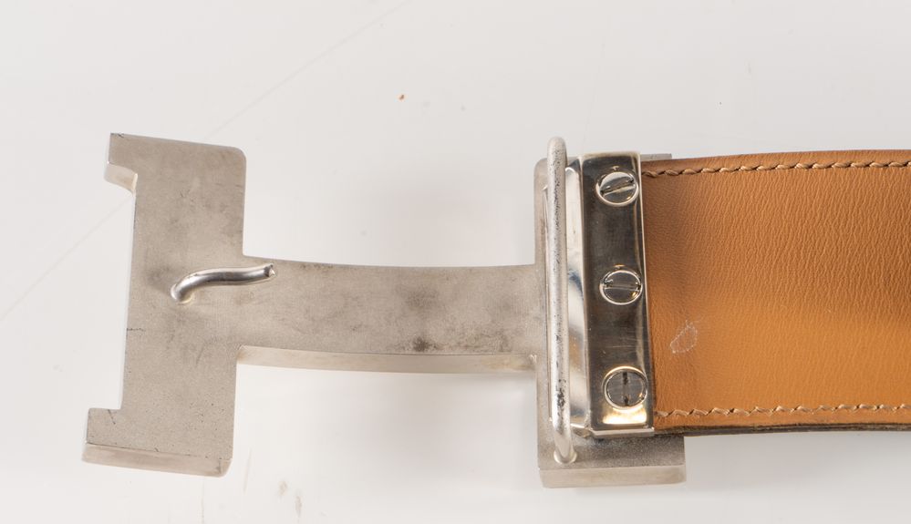 HERMÈS Cintura "H" in pelle nera con interno in pelle color cammello e fibbia...