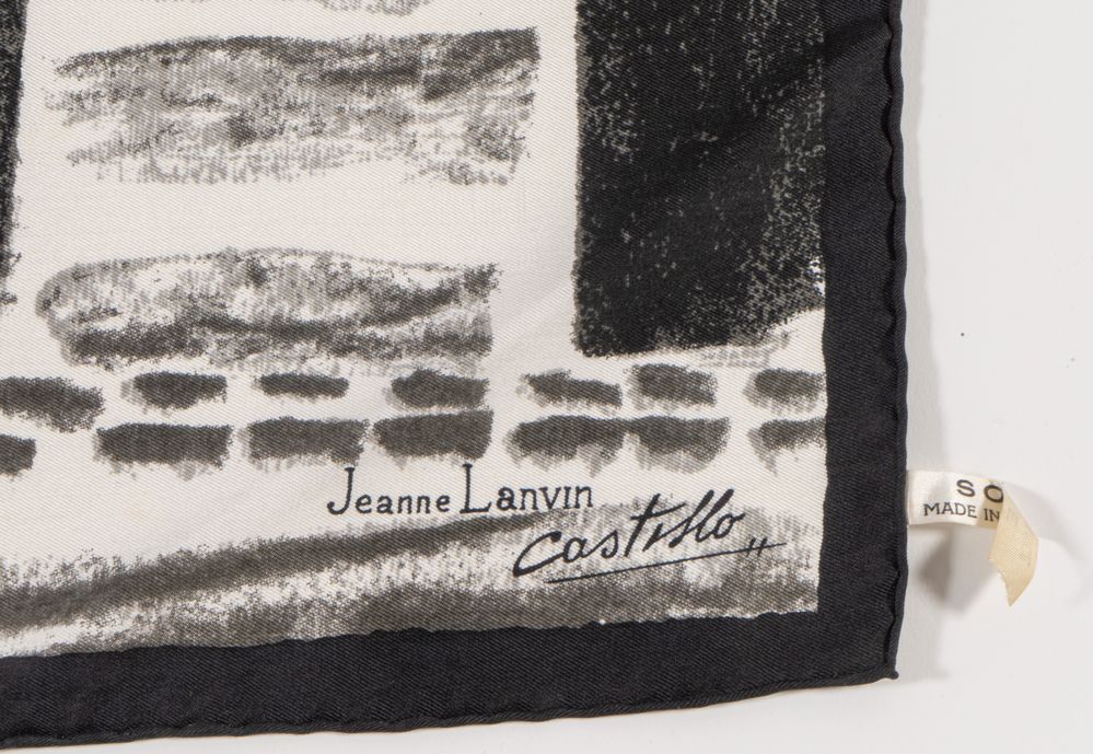 LANVIN Foulard in seta a fantasia sui toni del nero e del bianco. Anni '50/60. Cm 76x76. Composizione: 100% seta.Reca firma Jeanne Lavin Castillo. Reca etichetta Soie, Made in France. Corredata di scatola originale in buone condizioni.
