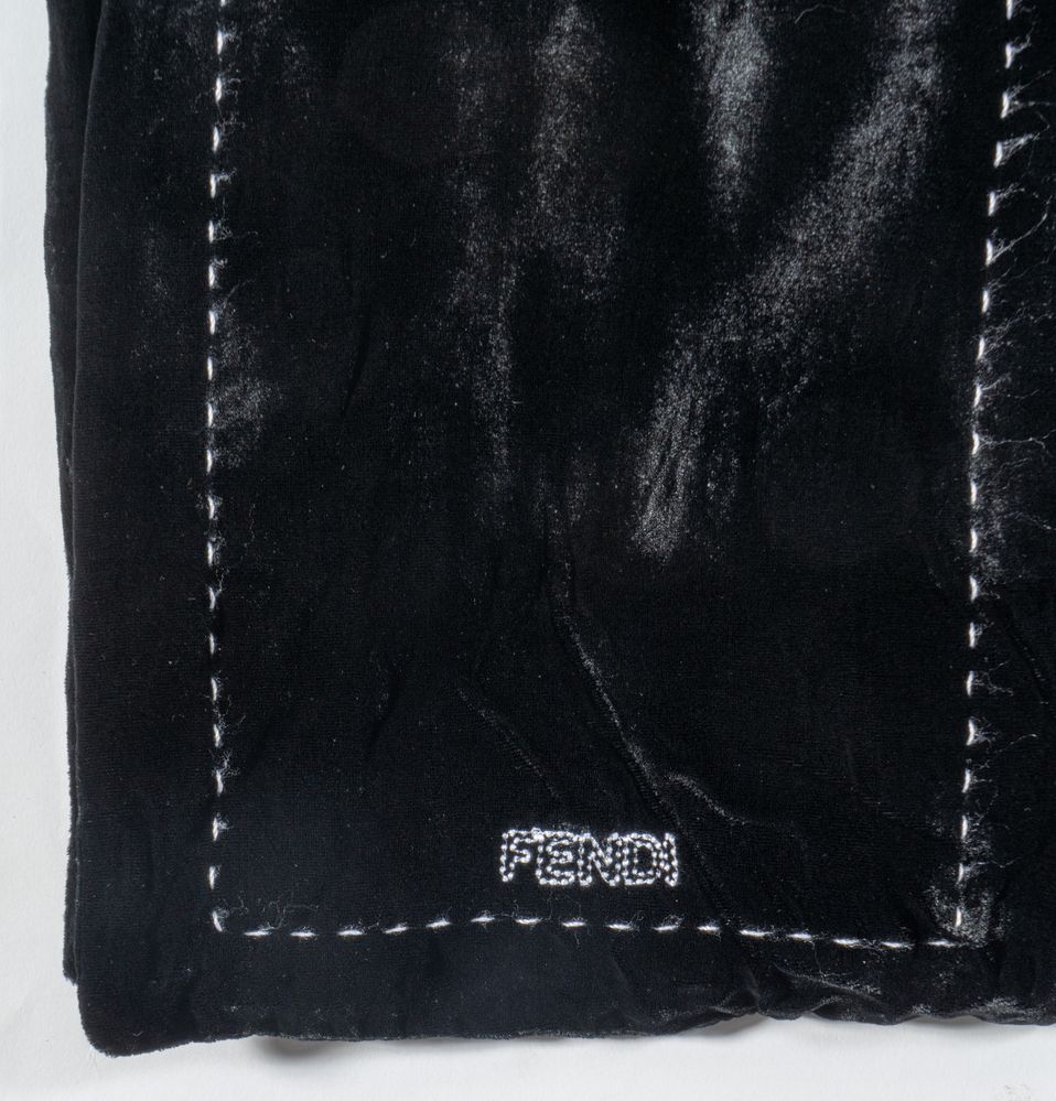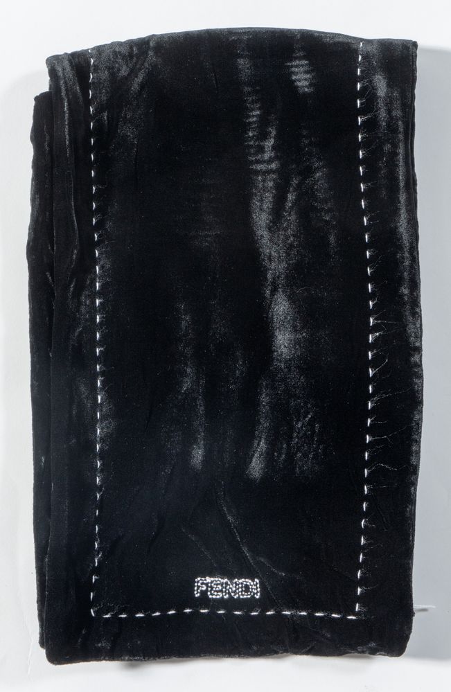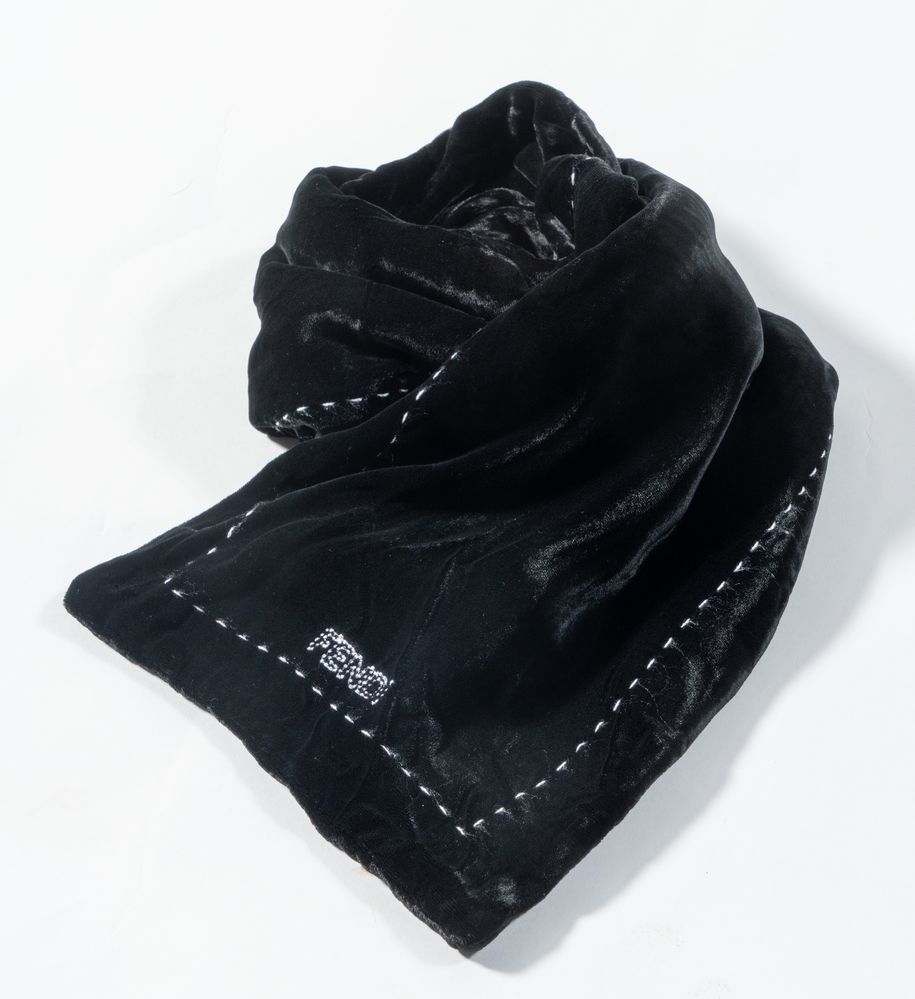 FENDI Sciarpa in velluto di seta sui toni del nero con rifiniture bianche. Cm 123x20. Composizione: 82% rayon e 18% seta. Reca marchi ed etichette Fendi, FF Fendi Foulard Made in Italy. (Lievi difetti)