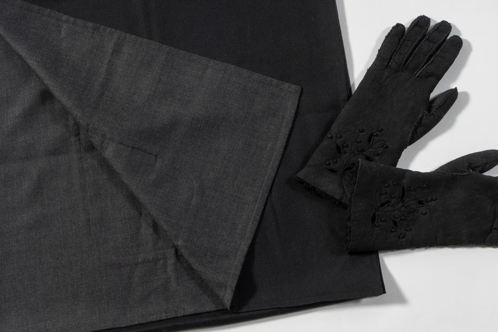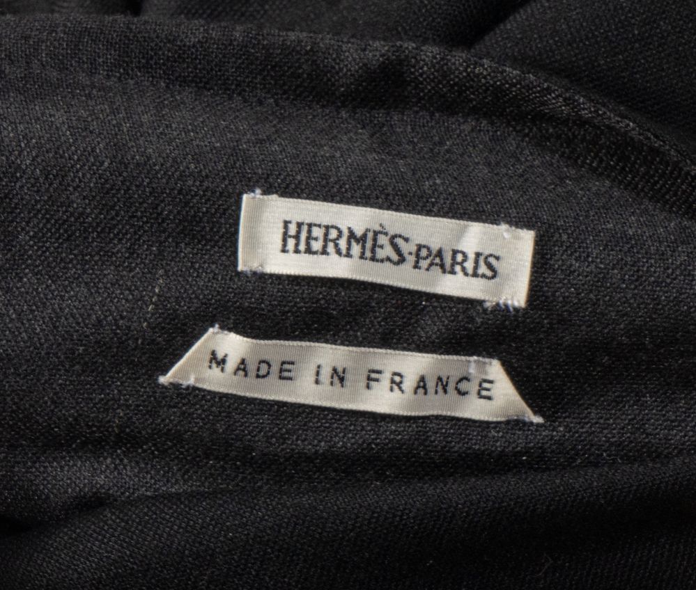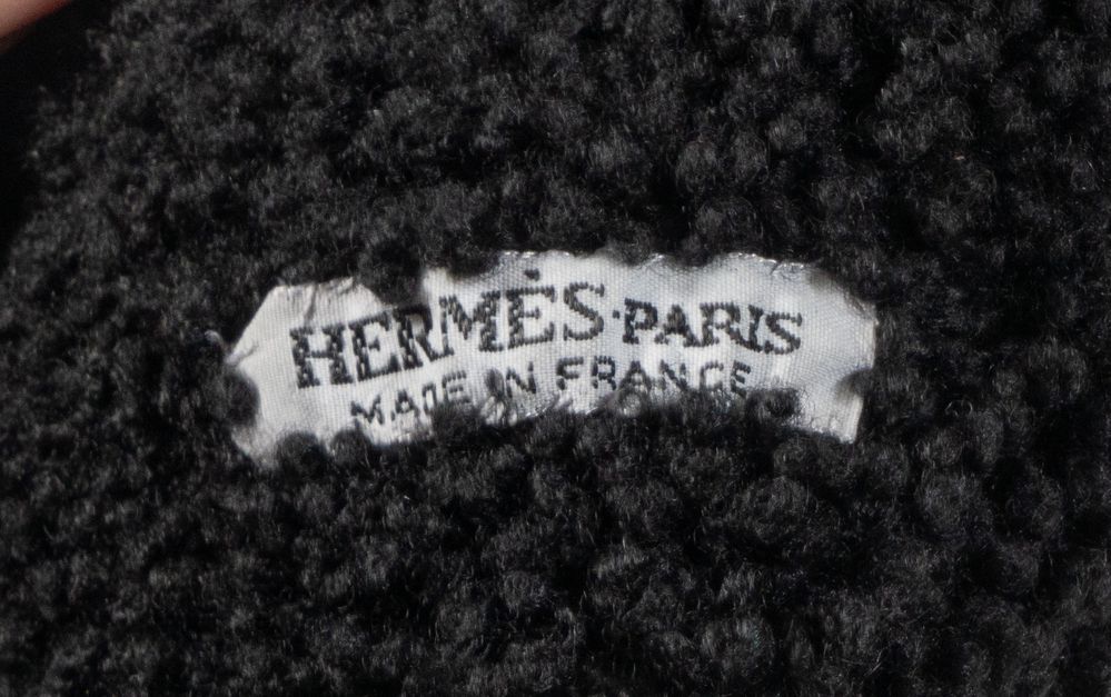 HERMÈS Lotto composto da guanti neri e stola con tasche in cashmere sui toni del nero e del grigio. Guanti: taglia 7. Dimensioni sciarpa: cm 200x50. Recano etichette Hermès Paris Made in France. (Lievi difetti)