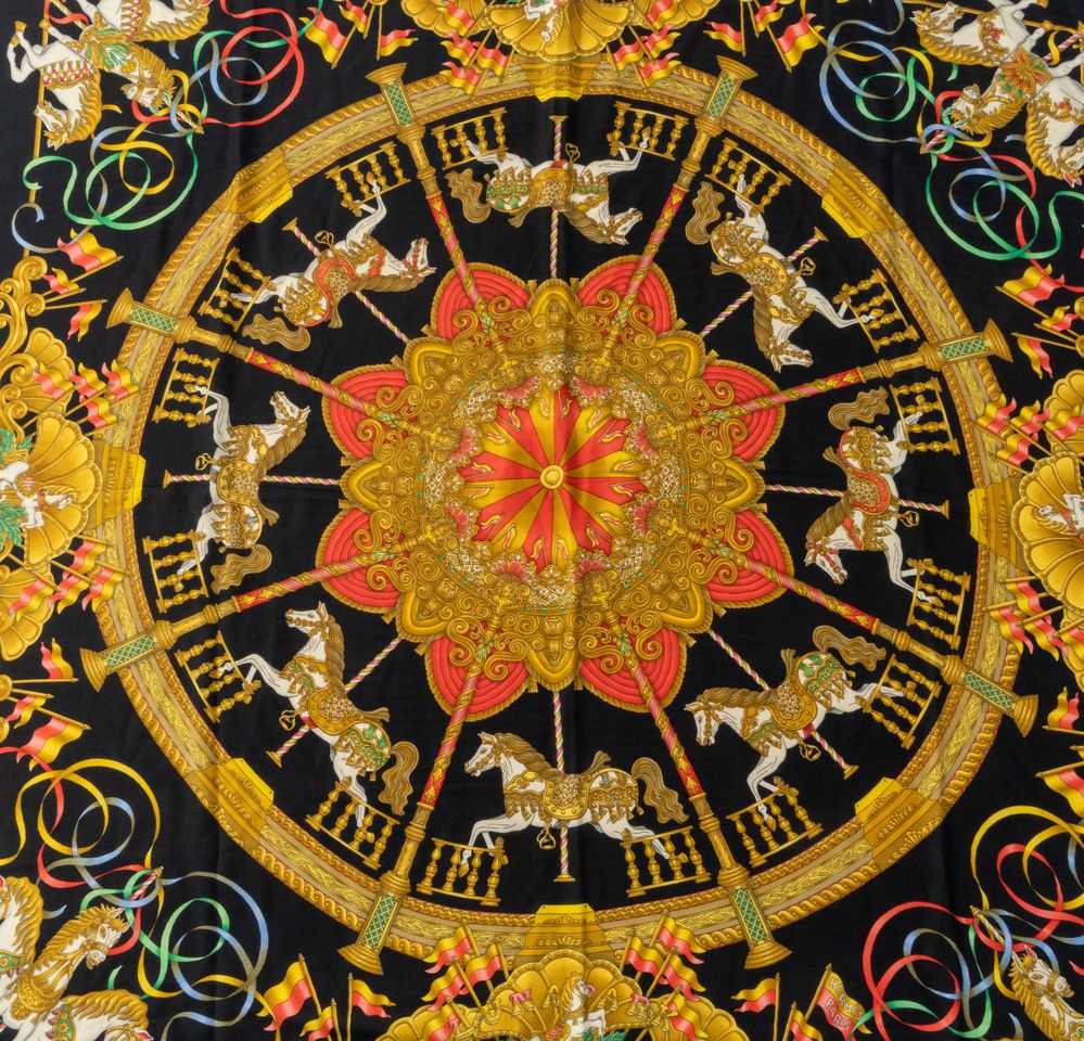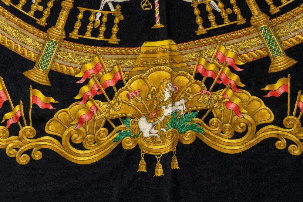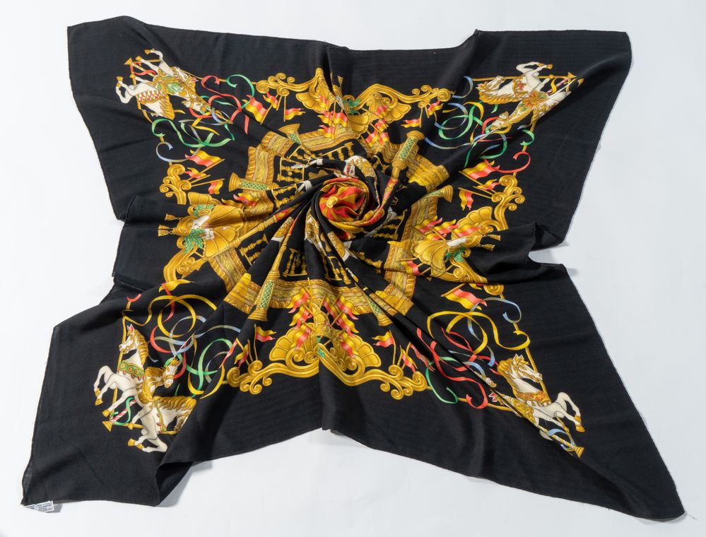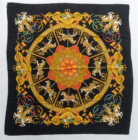 HERMÈS "Luna park". Stola in seta e cashmere a fantasia sui toni del nero e del giallo. Disegnato da Joachim Metz nel 1993. Cm 140x140. Composizione: 65% cashmere e 35% seta. Reca marchio Hermès Paris ed etichetta Made in France. (Lievi difetti)