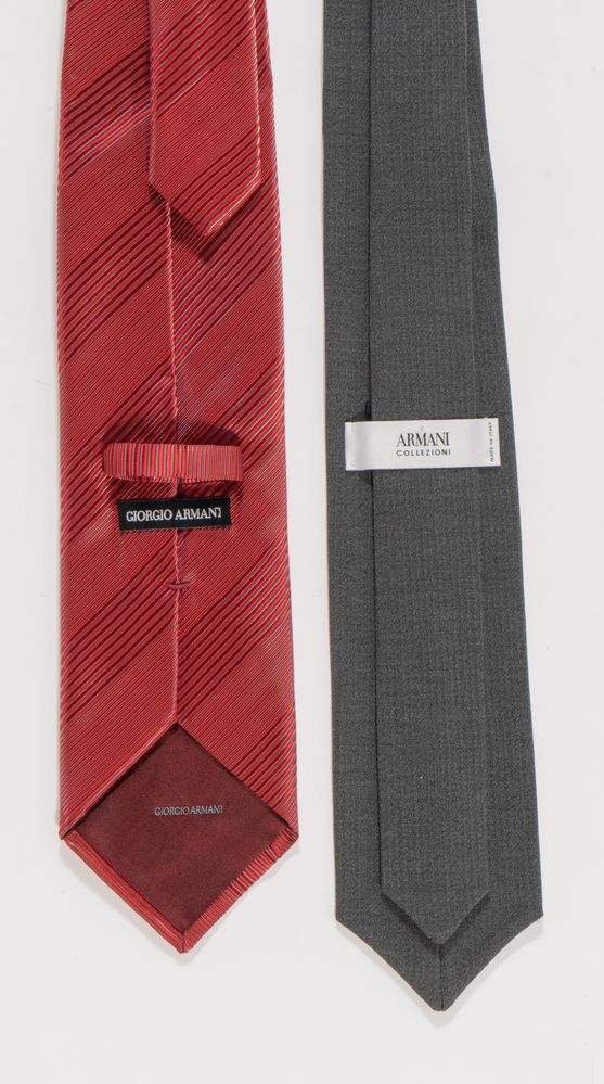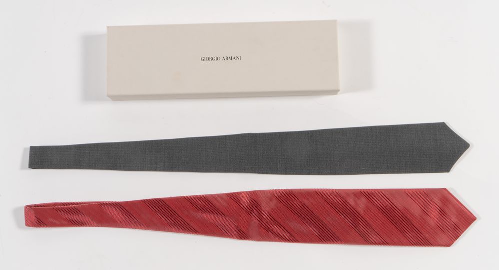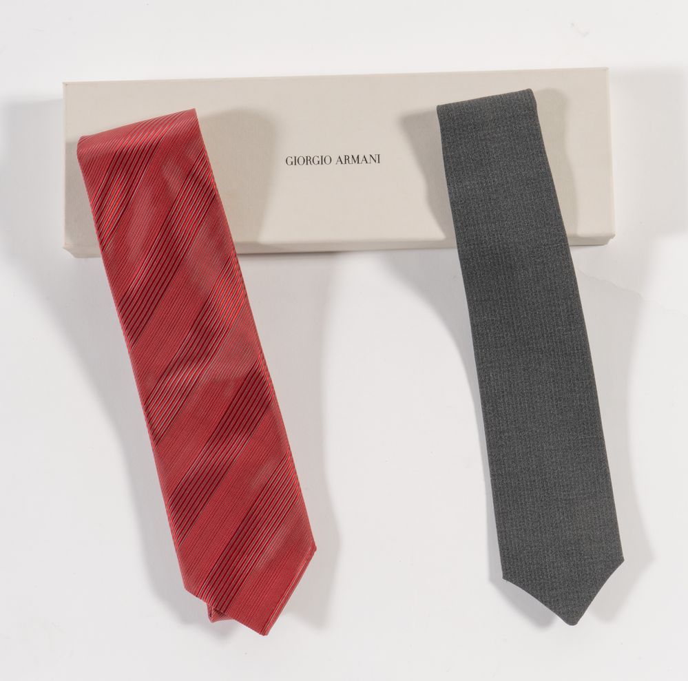 GIORGIO ARMANI, ARMANI Collezioni Lotto composto da due cravatte in seta e lana e seta sui toni del grigio scuro e del rosso. Anni '70 e '90 circa. Lunghezza cm 143 e cm 145. Composizioni: 64% lana, 23% poliestere, 11% seta, 2% elastano; 70% seta, 30% nylon. Recano etichette Armani collezioni Made in Italy, Giorgio Armani e handmade in Italy. Corredate di scatola originale.