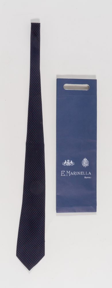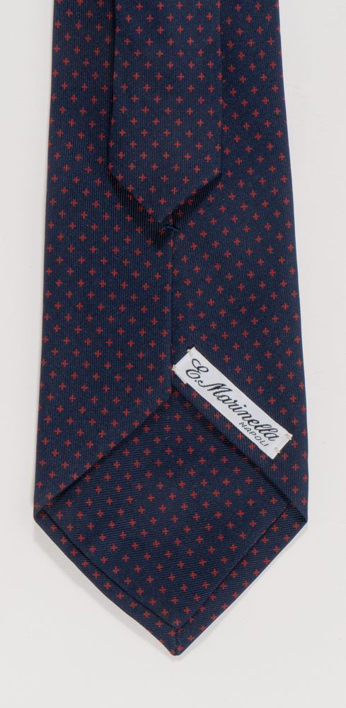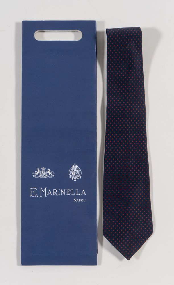 E. MARINELLA Cravatta in seta a fantasia a pois sui toni del blu e del rosso. Lunghezza cm 163. Composizione: 100% seta. Reca etichetta E. Marinella Napoli. Corredata di confezione originale.