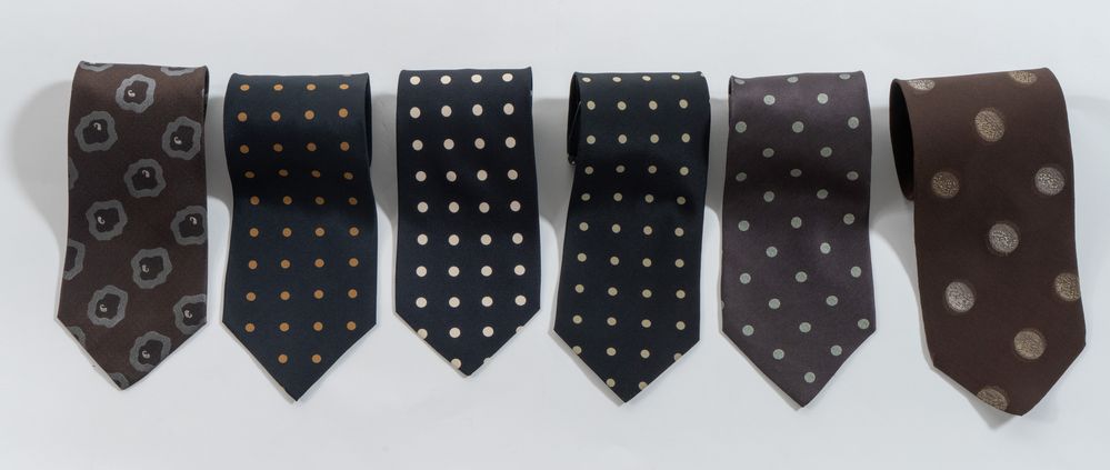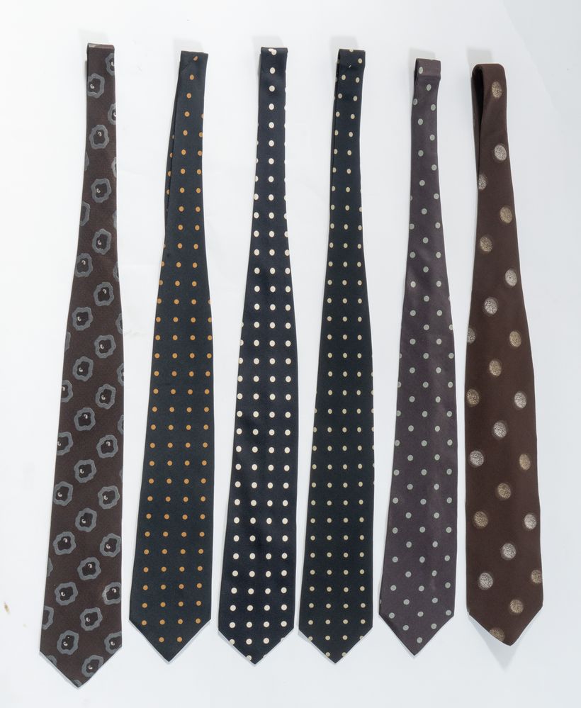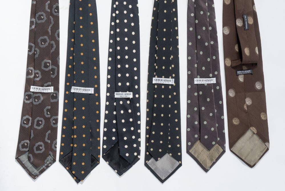 GIORGIO ARMANI Lotto composto da sei cravatte in seta a fantasia pois. Lunghezza cm 142-150. Composizione: 100% seta di cui una 90% seta e 10% poliestere. Recano etichette Giorgio Armani Made in Italy; Giorgio Armani; Giorgio Armani a Milano Borgonuovo 21; Giorgio Armani Cravatte, Made In Italy.