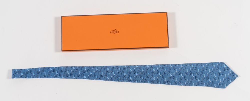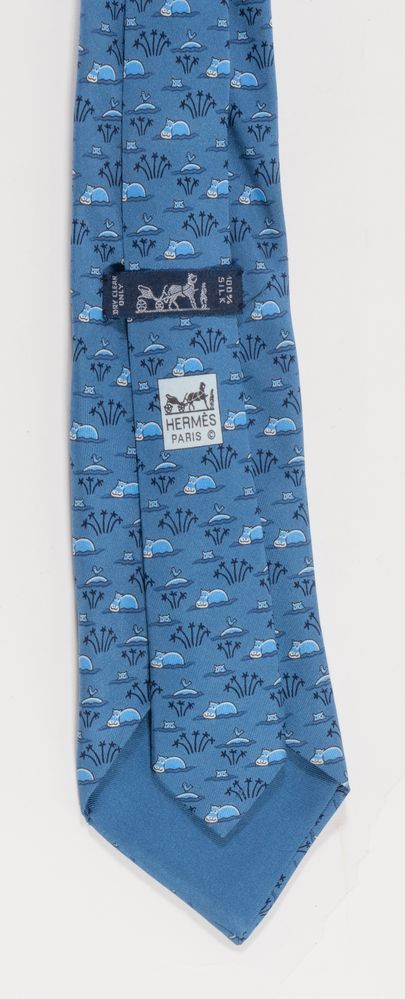 HERMÈS Cravatta in seta a fantasia con ippopotami sui toni dell'azzurro. Lunghezza cm 160. Composizione: 100% seta. Reca marchio ed etichetta Hermès Paris e marchio Made in France 5271 SA 100% soie. Corredata di scatola originale.