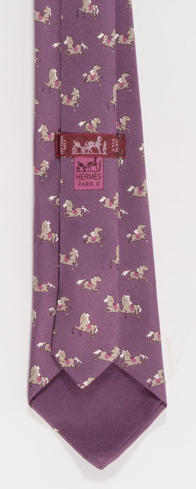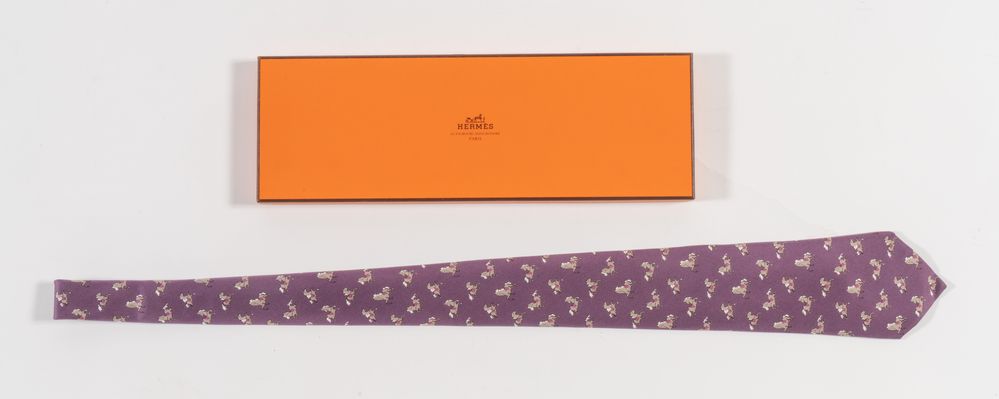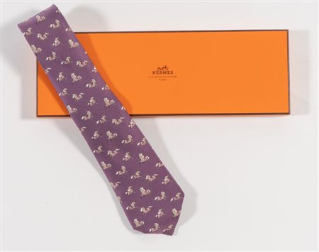 HERMÈS Cravatta in seta a fantasia con cavalli sui toni del viola. Lunghezza cm 155. Composizione: 100% seta. Reca marchio ed etichetta Hermès Paris e marchio Made in France 5418 OA 100% soie. Corredata di scatola originale.