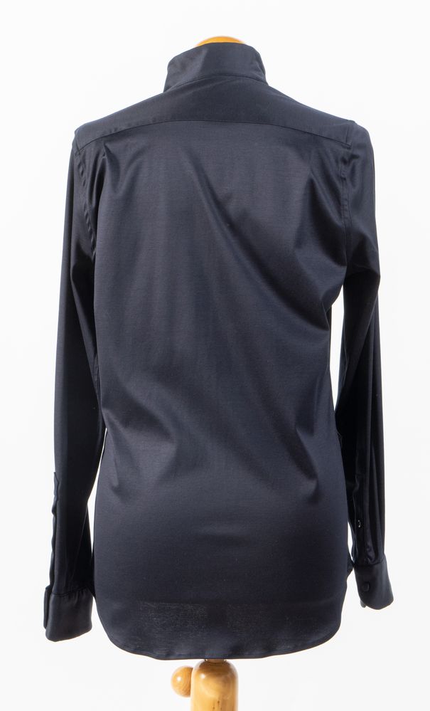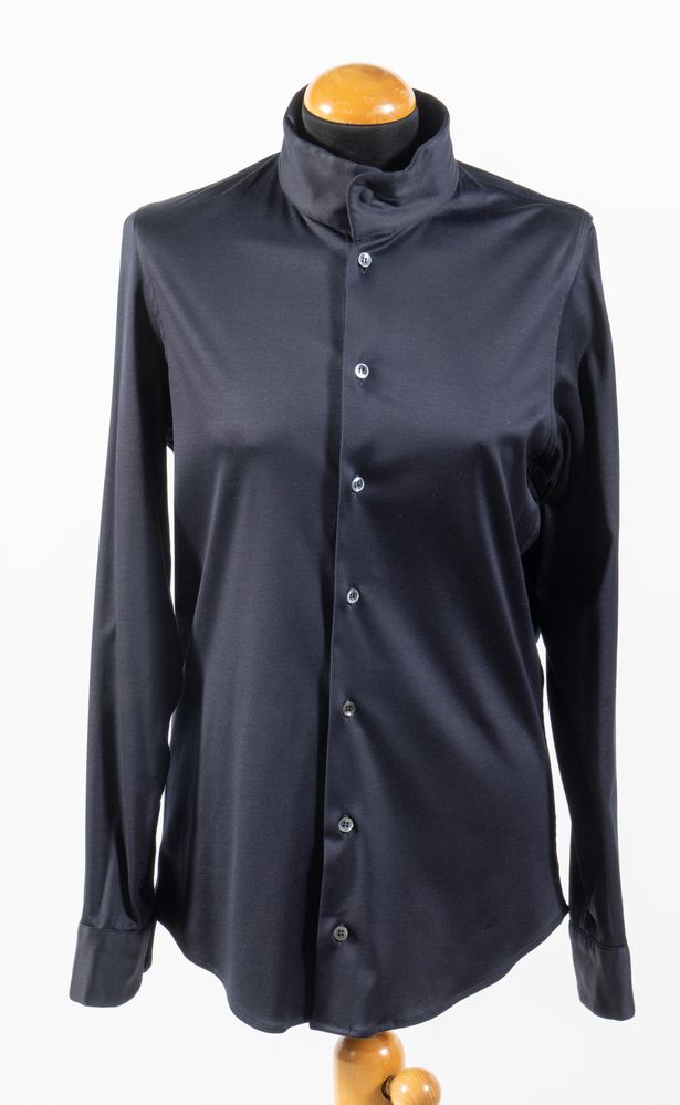 GIORGIO ARMANI Camicia in cotone blu con colletto alla coreana. Riporta taglia 38/15. Composizone: 100% cotone. Reca etichetta Giorgio Armani Made in Italy.